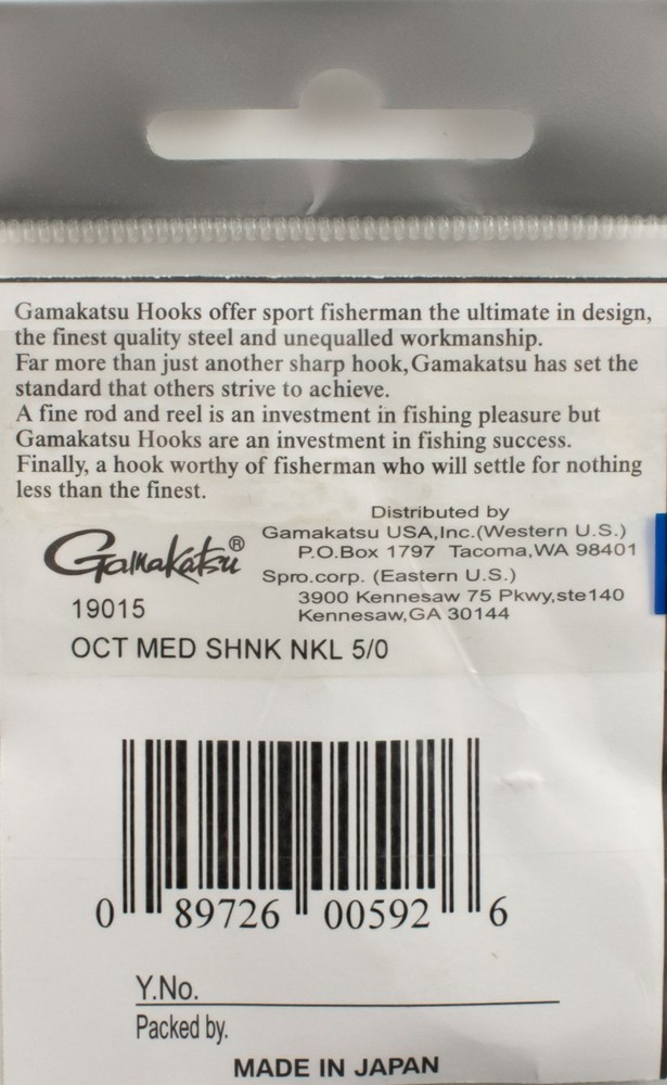 (LOT OF 6) GAMAKATSU OCTOPUS MED SHANK NICKEL HOOK 5/0 19015 K3380 (LOT OF 6) GAMAKATSU OCTOPUS MED SHANK NICKEL HOOK 5/0 19015 K3380 Gamakatsu hooks offer sport fishermen the ultimate in design, the finest quality steel and unequalled workmanship. Far more than just another sharp hook, Gamakatsu has set the standard that others strive to achieve. A rod and reel is an investment in fishing pleasure, but Gamakatsu hooks are an investment in fishing success. Finally, a hook worthy of fishermen who will settle for nothing less than the best. Hook Size: 5/0 Quantity: 5 Per Pack PAYMENT TERMS VISA, MASTERCARD, AMEX, OR DISCOVER PAYPAL APPLE PAY GOOGLE PAY PAYMENTS MUST BE MADE IN FULL WITHIN 7 DAYS SHIPPING TERMS ALL PAID ORDERS SHIP WITHIN 1 BUSINESS DAY INSURANCE IS INCLUDED IN SHIPPING PRICE COMBINED ORDER POLICY ORDERS ARE COMBINED NIGHTLY AFTER END OF ALL AUCTIONS. DO NOT PAY FOR INDIVIDUAL ITEMS ENDING ON THE SAME DATE IF YOU WANT THE ORDER COMBINED. ALLOW US TIME TO SEND YOU A COMBINED INVOICE. ORDERS THAT ARE PAID FOR ON DIFFERENT DATES ARE NOT OUR RESPONSIBILITY TO COMBINE. ITEMS MUST BE PAID IN FULL WITHIN 7 DAYS FROM THE END OF 1ST AUCTION. COMBINED ORDER PRICING BAITS - EACH ADDITIONAL AUCTION $1.00 REELS - EACH ADDITIONAL AUCTION $1.00 RODS* - EACH ADDITIONAL AUCTION $1.00 *ALL RODS WILL ONLY COMBINE WITH RODS OPERATING HOURS BUSINESS HOURS ARE MONDAY - THURSDAY 9AM-5PM CENTRAL TIME & FRIDAY 9AM-3PM CENTRAL TIME, EXCLUDING HOLIDAYS EBAY MESSAGES ARE ANSWERED DURING NORMAL BUSINESS HOURS DUE TO THE OVERWHELMING AMOUNT OF ONLINE ORDERS WE ARE EXPERIENCING, LONGER THAN NORMAL RESPONSE TIME TO EMAILS MAY OCCUR. PLEASE BE PATIENT.