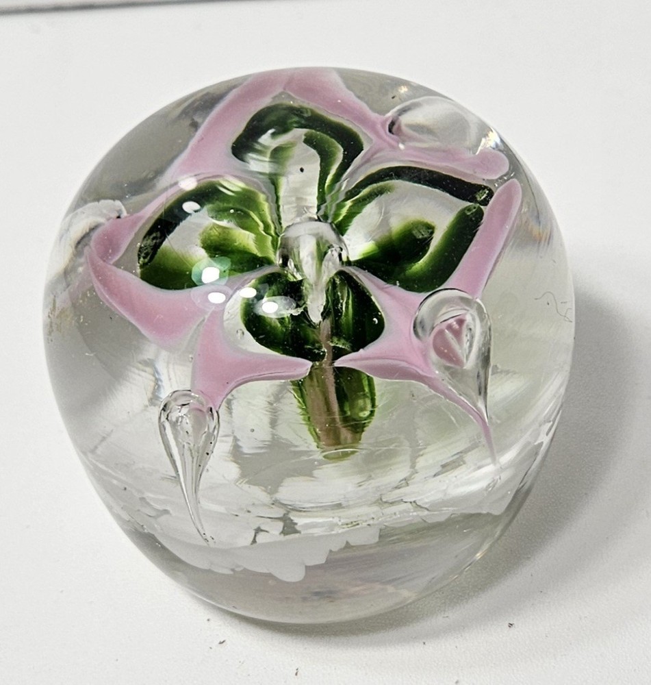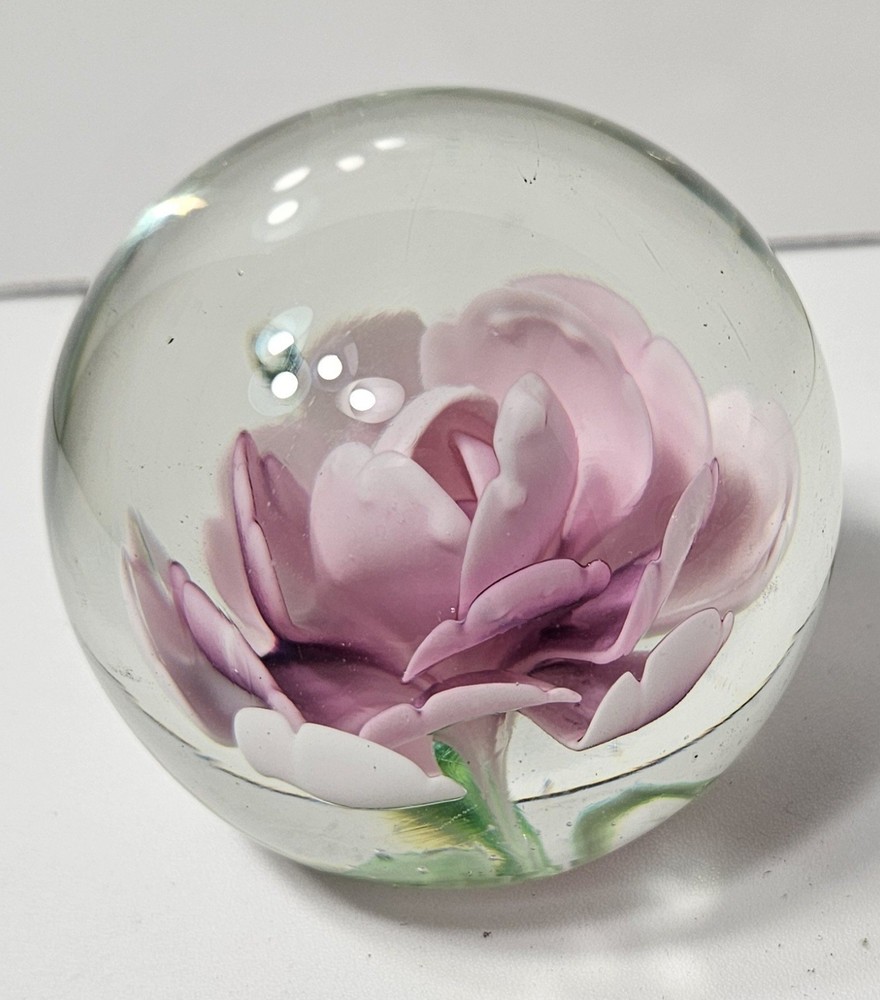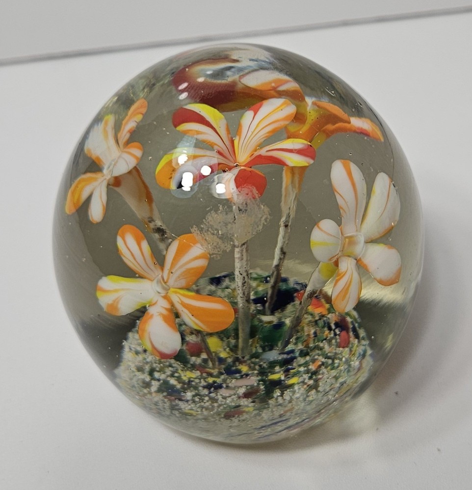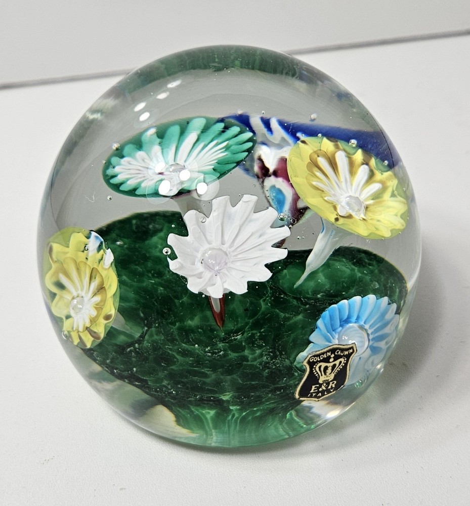 This listing includes a set of six vintage Murano flower glass paperweights featuring a swirl pattern and multicolored design. Handmade in the United States using art glass techniques, these decorative paperweights showcase the intricate craftsmanship of Murano glass. The glossy finish and incised backstamp add to the collectible value of these antique pieces, making them a unique addition to any pottery and glassware collection.