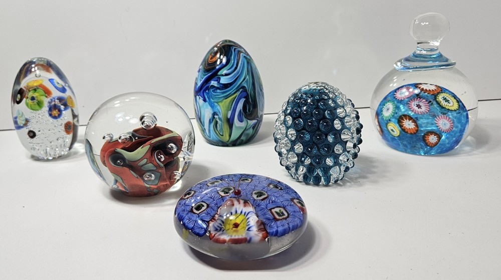 This lot of 6 vintage Murano glass paperweights features a beautiful swirl pattern in multicolored glass, made with the traditional hand-blown production style and glossy finish. Each paperweight is uniquely handmade with an incised backstamp, showcasing the intricate craftsmanship and art glass production technique. These decorative pieces are perfect for adding a touch of antique charm to any collection or space.