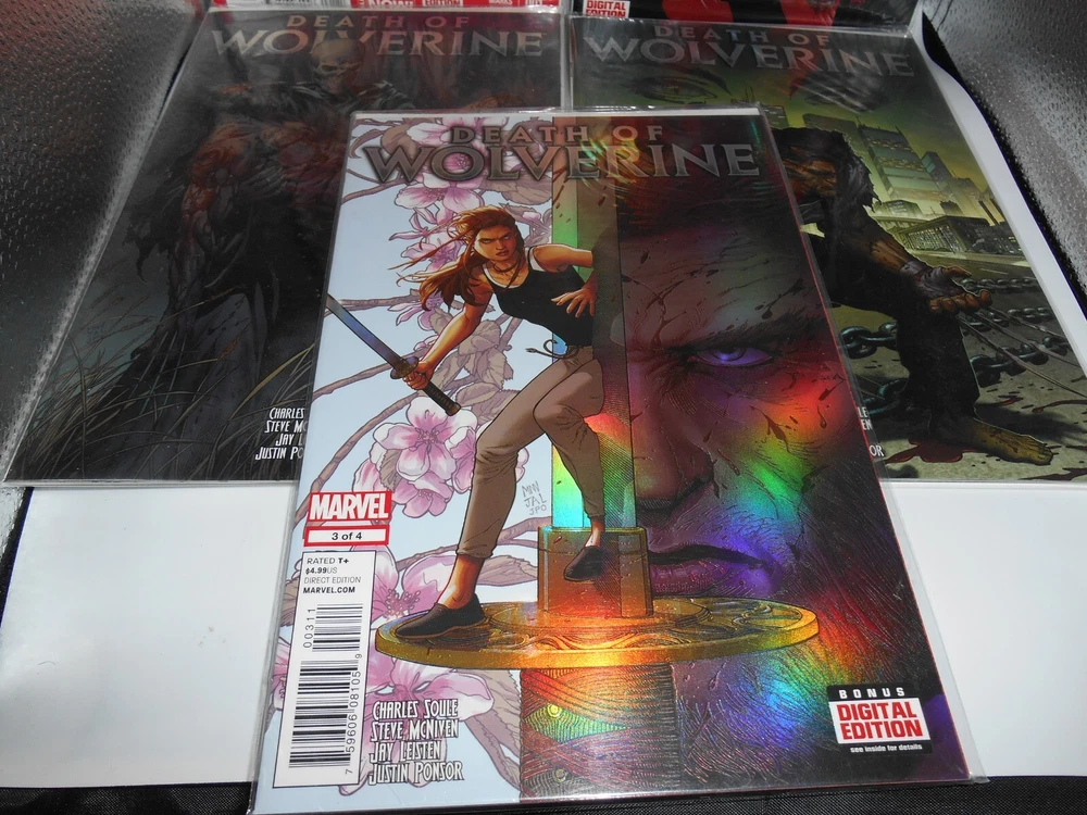 Universe: Marvel (MCU) Superhero Team: Avengers, X-Men Signed: No Character: Wolverine (Logan) Variant Type: FOIL COVER, CANADA EDITION Unit of Sale: Comic Book Lot Inscribed: No Tradition: US Comics Vintage: No Issue Number: 1 Features: First Printing, Boarded, Set Artist/Writer: Charles Soule, Steve McNiven Style: Color Cover Artist: Steve McNiven Intended Audience: General Audience Type: Comic Book Personalized: No Genre: Action, Classics, Fantasy, Superheroes Country/Region of Manufacture: Canada Series Title: Death of Wolverine Format: Single Issue Convention/Event: N/A Era: Modern Age (1992-Now) Publication Year: 2014 Publisher: Marvel Comics Language: English Story Title: DEATH O F WOLVERINE