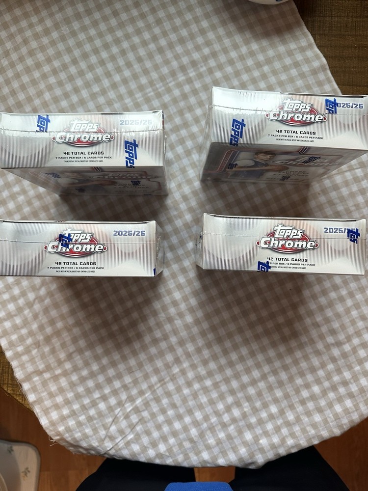 The 2025-2026 Topps Chrome Basketball Mega Box features standard-sized trading cards of NBA players, focusing on the 2025-26 Chrome set. This sealed box includes four counts of cards, with one autographed card of Stephen Curry, signed in hard format and authenticated by Topps. The cards are made of card stock and include exclusive, rookie, and insert features. With a focus on the Golden State Warriors and the NBA Finals, this collection is a must-have for basketball card enthusiasts looking for unique and valuable additions to their collection. Coms wit FOUR SEALED MEGAS AS SEEN
