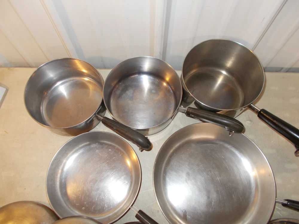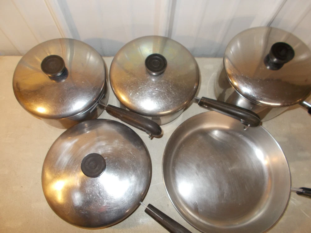 7--LOT OF VINTAGE REVERE WARE PANS, 10" SKILLET NO LID, 8" SKILLET, 3 QT SAUCEPAN AND I CAN'T MAKE OUT THE SIZE OF THE OTHER 2 BUT LOOK LIKE 2 QT SIZE and THEY ARE THE SAME SIZE