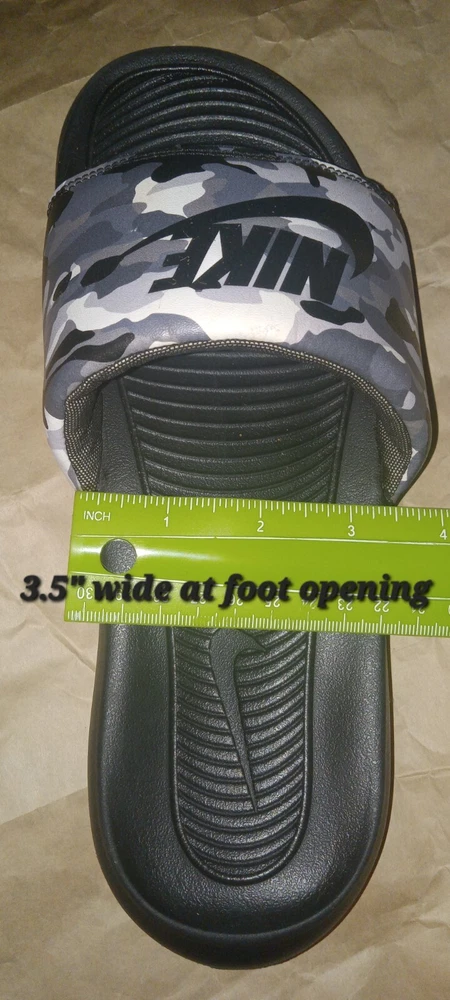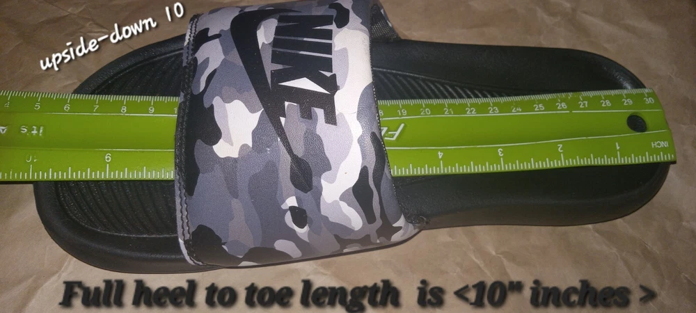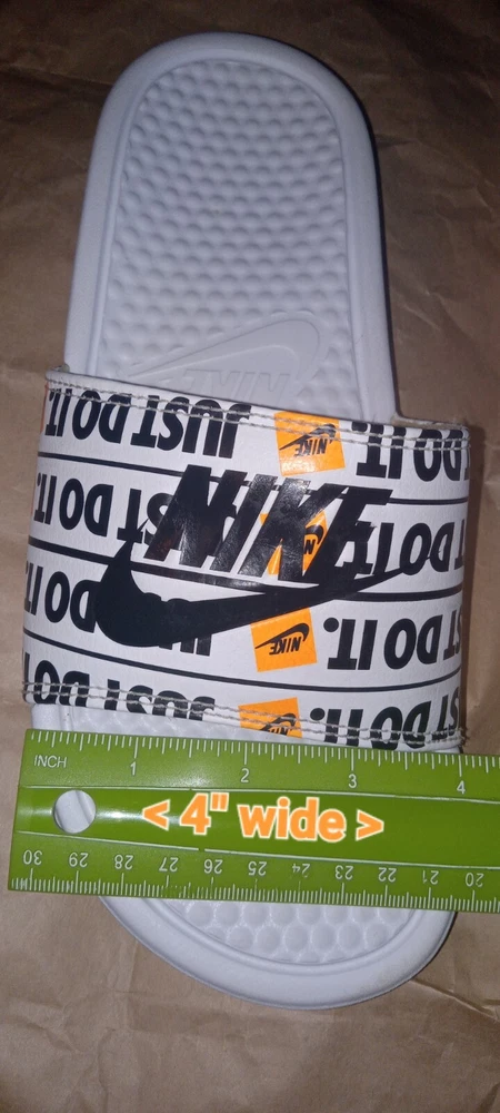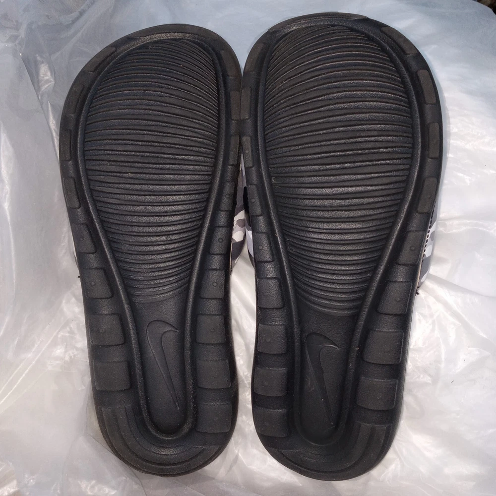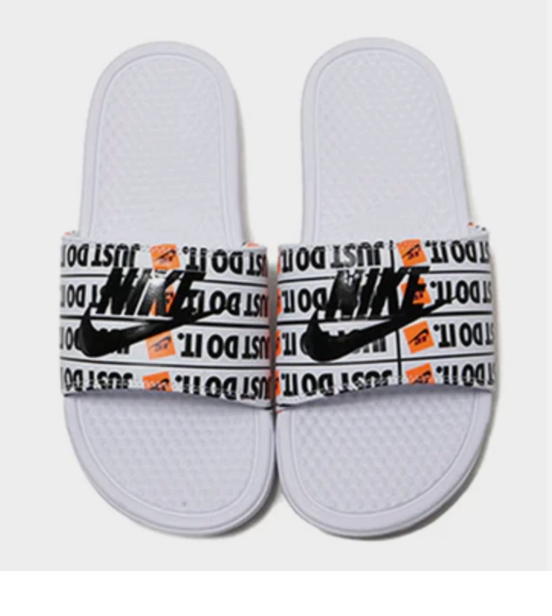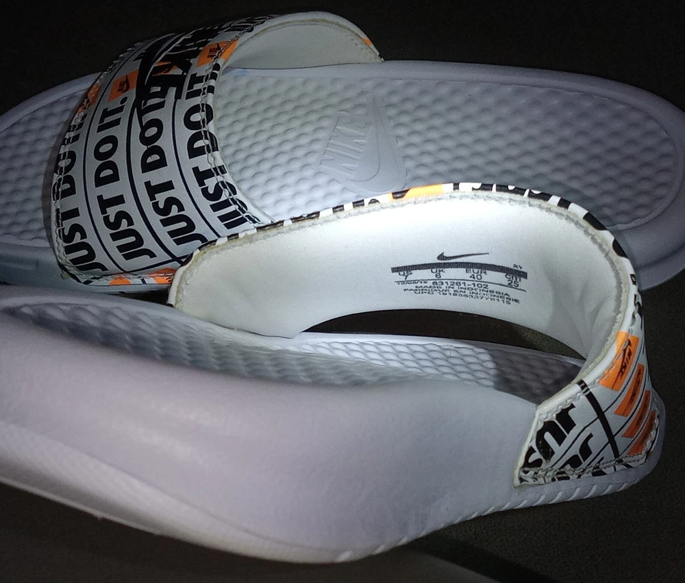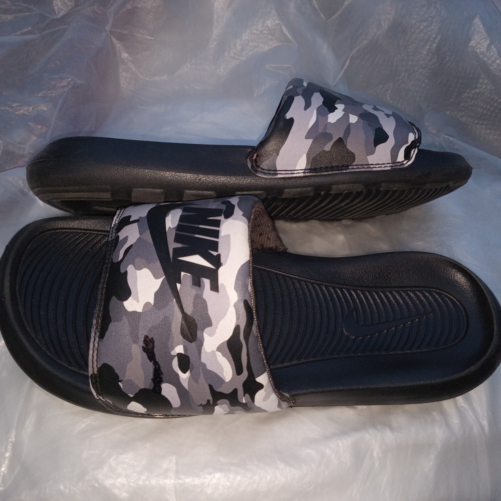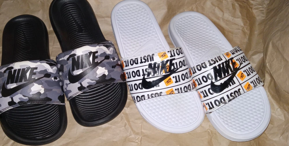 END of Summer DISCOUNT! Lot of two pairs of authentic, classic NIKE Slides. Both pairs in NEW condition and are US size 7 mens . 1ST Pair : NIKE Victori One Camo Print CN9678-01, Black slides, classic camouflaged strap, with "NIKE" and signature Swoosh across the top. AND 2ND Pair: the NIKE Benassi JDI Print 631261-102 , the White slides, white strap with multiple"JUST DO IT"across entire strap, with "NIKE" Swoosh on top of that, all black text over white, then the aligned rows of small orange NIKE swoosh squares gives the perfect color pop that completes this eye catching design.