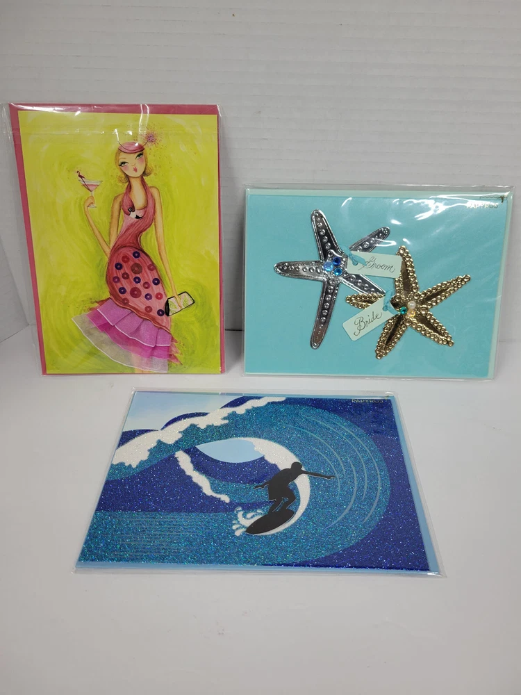 Lot of 3 New sealed - Papyrus greeting cards & envelopes. 1. Flapper party lady - blank inside 2. Surfer - Birthday greeting 3. Starfish - Bride & Groom - Wedding sentiments. Item will ship within one business day of completed sale. I DO NOT ship media mail. All items will be securely packaged and will ship USPS Ground Advantage, Priority mail, UPS or Fedex depending on weight and size. I do offer a 30-day money back guarantee on almost every item I sell. If there are issues with your item, please return it for a refund. Refund will be issued upon return of item. Some restrictions may apply. It is always appreciated if you contact me before starting a return so that I can try and assist without the hassle of a return.