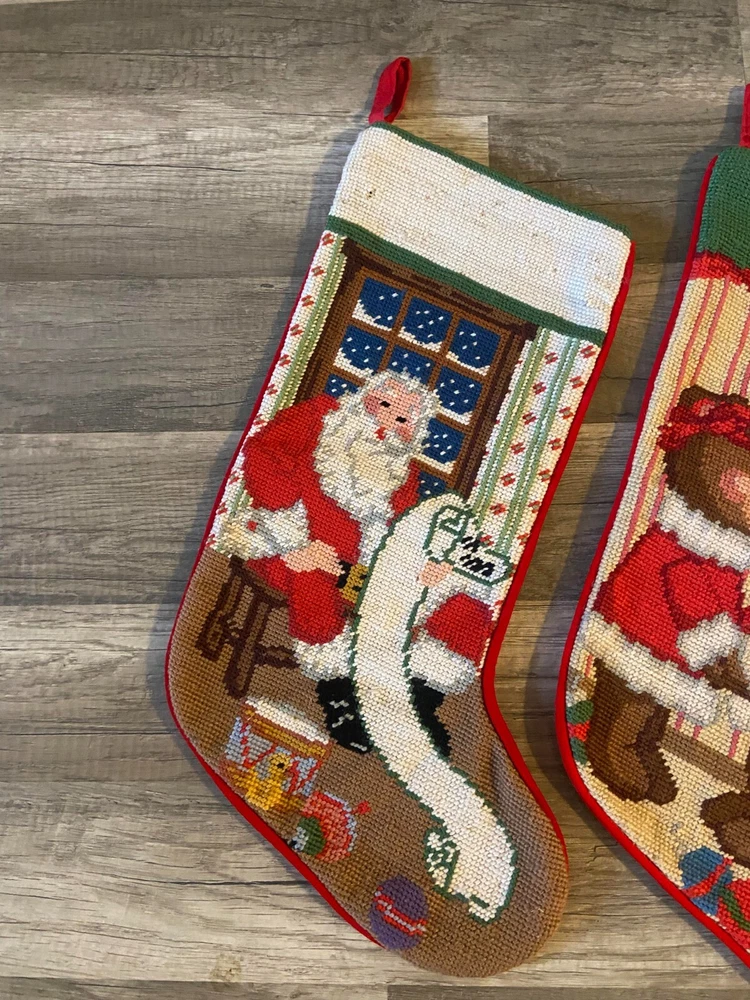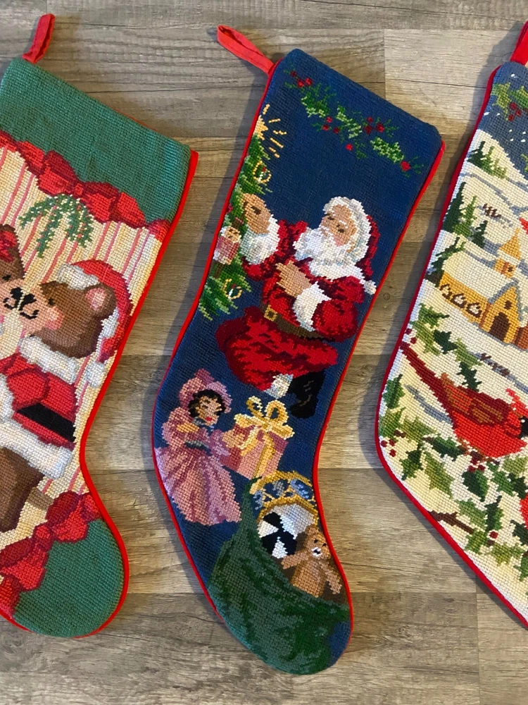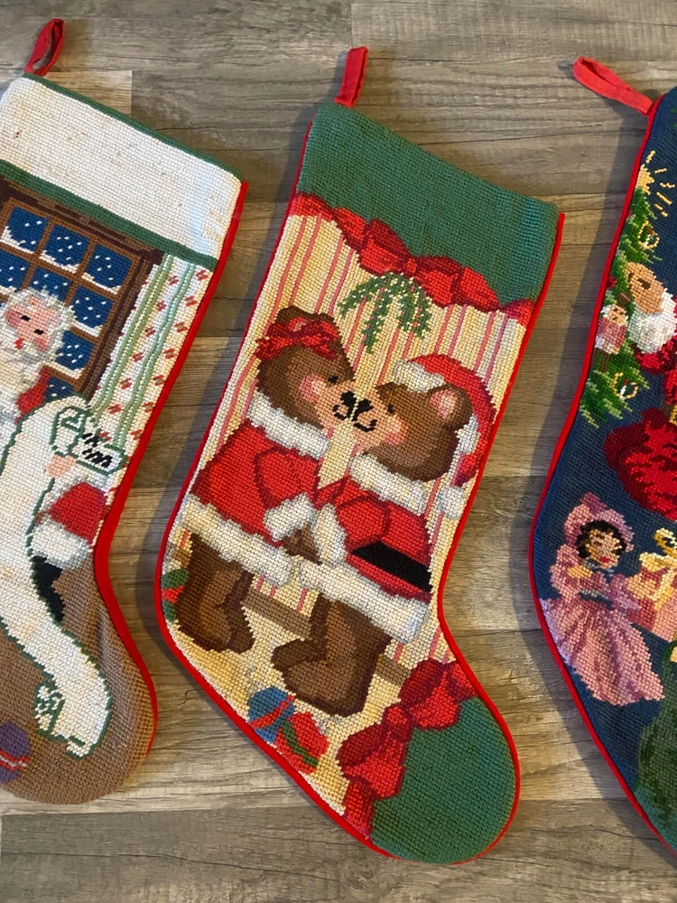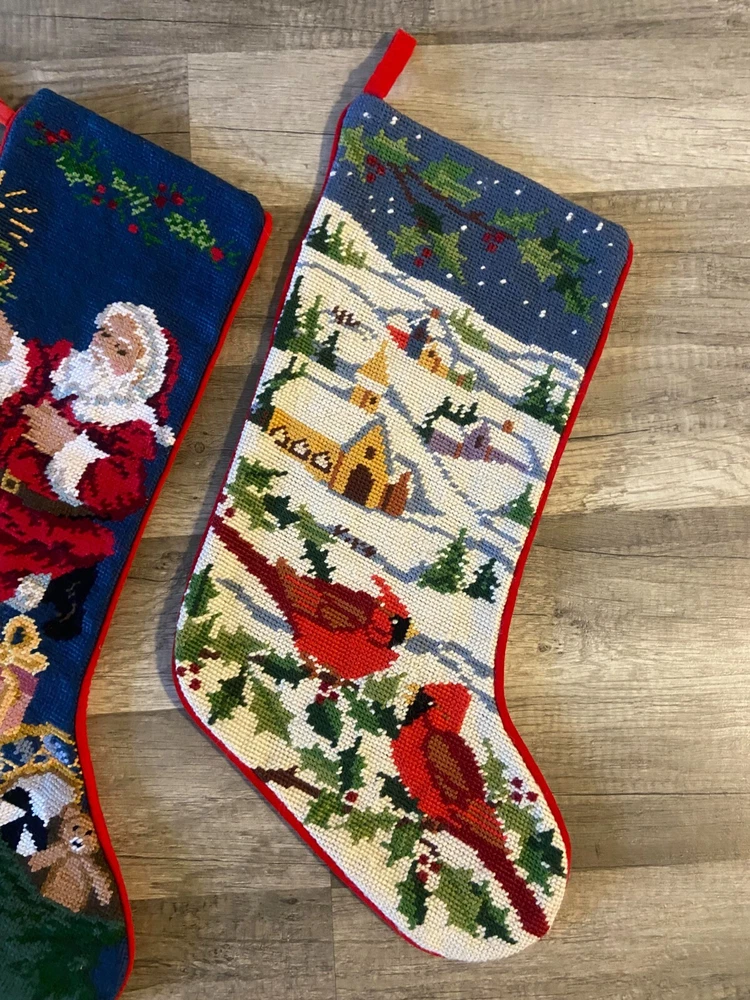 🥰😊 PLEASE READ ---->>> I do NOT sew directly onto my stockings (my free hand embroidery would not win any awards, lol). When entering your name in the box, you are acknowledging that you have read and understand the item description. ⛔❤️ 🥰❤️PLEASE MESSAGE ME PRIOR TO LEAVING A REVIEW IF YOU HAVE ANY QUESTIONS, CONCERNS OR DO NOT UNDERSTAND SOMETHING. THANK YOU SO MUCH! 🙂🥰 LOT of FOUR Handmade Needlepoint Santa Cardinal Teddy Bears LINED Christmas Stockings Each stocking measures approximately between 18 to 20" (measured diagonally) Cute vintage lot for your family or decor this season! 🎅 All stockings are lined. 😊 PLEASE SEE PICS THEY ARE PART OF DESCRIPTION. SHIPS WITHIN 24 HOURS OF ORDERING! PET FRIENDLY - SMOKE FREE HOME! BE SURE TO CHECK OUT MY OTHER KITS AND FINISHED STOCKINGS AVAILABLE!