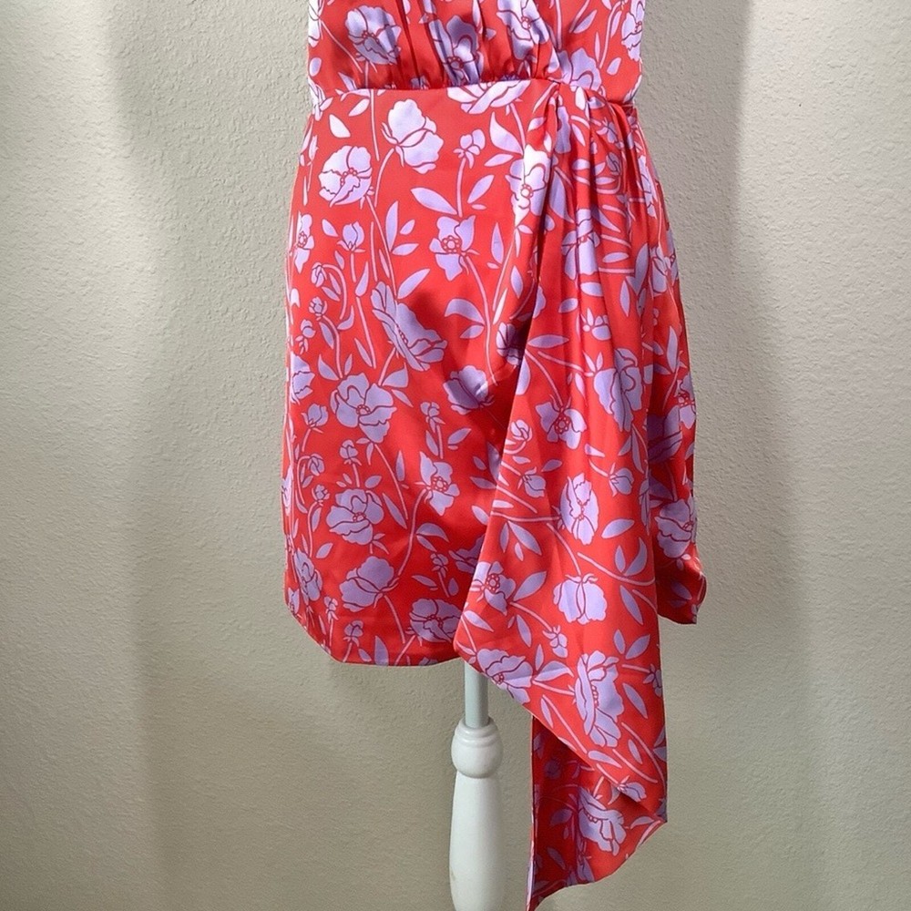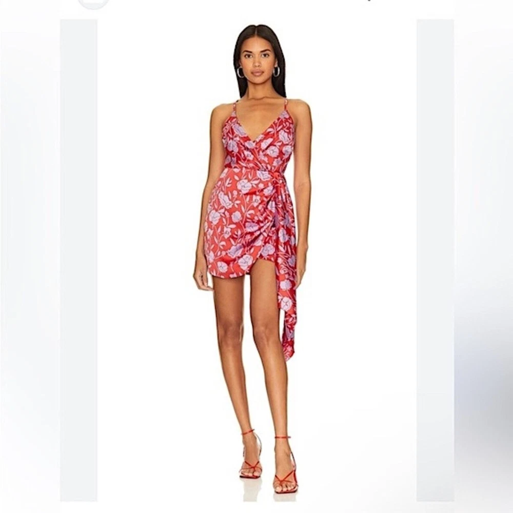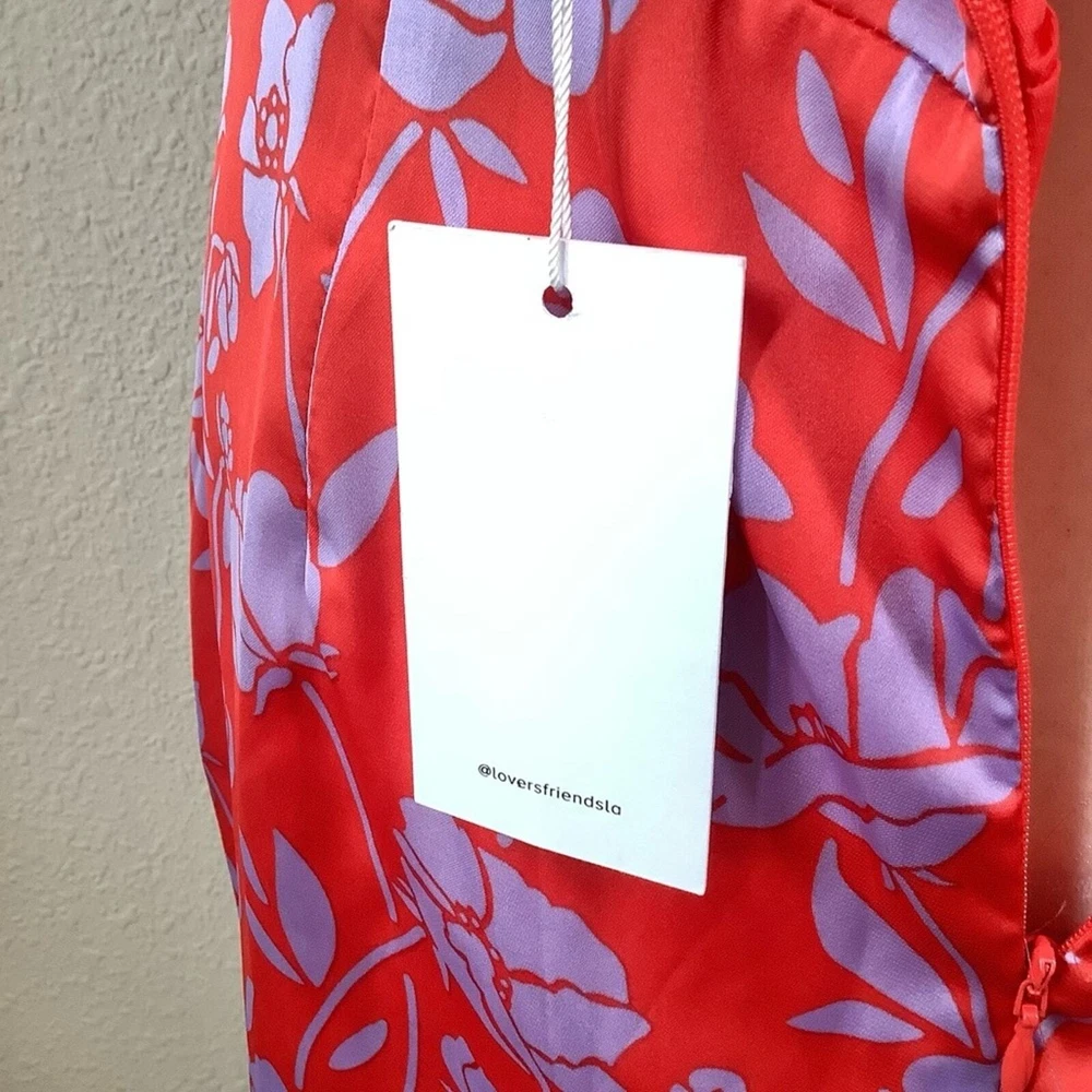 LOVERS & FRIENDS x Revolve Kamala Floral Satin Mini Dress Size: Large | L 100% poly - silky, satin - non-stretch Hand wash cold Fully lined Satin fabric with draped accent Tulip hem Adjustable shoulder straps Hidden back zipper closure Red & purple Style No. LOVF-WD2072 NEW with tag Flat Lay Measurements: Pit to Pit: 18" Waist: 15" Length: 33" Smoke & Pet Free sexy, clubbing, dancing, vacation, girls trip, homecoming, cruise, resort, beach wedding, wedding guest, date night, cocktail party, party, event