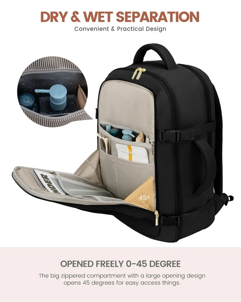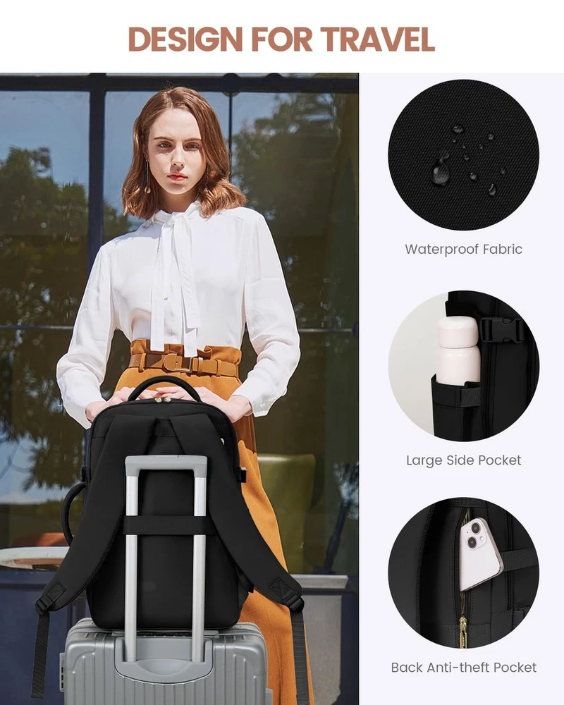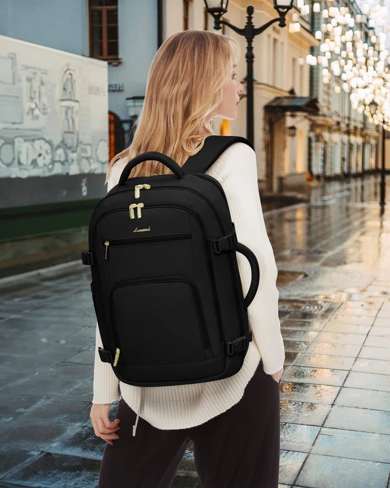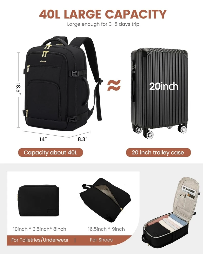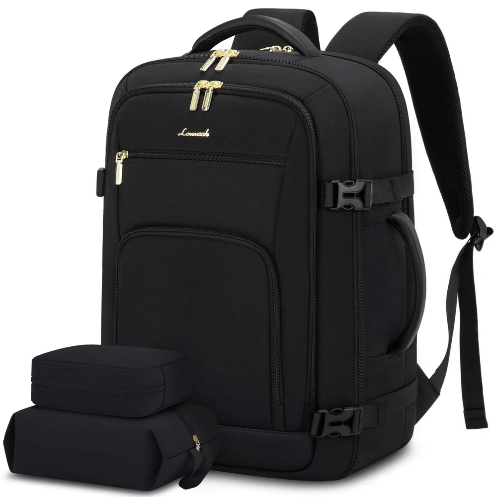 LOVEVOOK Carry On Travel Backpack For Women Men Flight Approved, 40L Personal Item Backpack for Airplanes, Business Weekender Overnight Daypack Fits 17 Inch Laptop, With 2 Packing Cubes, Black Product Details Size: 40L-17.3 Inch-3Pcs Color: Black Brand: LOVEVOOK MPN: Travel Backpack For Women Men UPC: Does not apply EAN: Does not apply Product Dimensions: 4 x 10 x 14 inches Item Weight: 3.05 pounds Department: womens Item model number: Travel Backpack For Women Men Age Range Description: Adult Number Of Items: 1 Units: 1 Count Capacity Total: 40 Liters Airline Approved & TSA Friendly : Experience stress-free air travel with our carry on backpack. Measuring 14" x 8.3" x 18.5", it fits comfortably in overhead bins and under the seat. Designed for quick security checks, it opens 180 degrees, making it the perfect travel companion for your journeys. Large Capacity With Great Organization : This travel backpack boasts a generous 40L capacity, perfect for 3-5 days of travel essentials. 3 Big compartments and 18 pockets, ensuring everything is neatly organized. A dedicated and padded compartment fits a 17.3-inch laptop for maximum safety. The elastic band water bottle pocket securely holds a 500ml bottle. This versatile construction design makes this backpack perfect for travel, business trips, weekend getaways, and everyday use. Sturdy & Comfortable : Upgraded with explosion-proof zippers and water-resistant fabric, this backpack is built for longevity. Its reinforced, tear-resistant shoulder straps and breathable sponge padding ensure comfort and longevity. It's perfect as a carry on backpack for airplanes, day trip weekender overnight backpack, camping hiking backpack, business backpack, commuting work backpack, college backpack, or casual daypack. With 2 Packing Cubes & Wet Pocket : Our travel backpack for women equipped with 1 carry-on pocket, deal for neatly storing underwear, socks, and small clothes. And equipped one shoe bag with 16.5 inches/42cm long, can hold 1~2 pair of shoes. The high-density waterproof wet pocket is perfect for toiletries and damp clothes, keeping your travel belongings tidy and separated. Ideal Gift for Travel Enthusiasts : The LOVEVOOK backpack for women travel bag is a perfect gift for birthdays, Thanksgiving, Christmas, New Year, and Valentine's Day. Suitable for men and women, wife, girlfriend, mother, daughter, and friends, it's a versatile companion as a travel backpack carry on flight approved, travel laptop backpack, or personal item pack.
