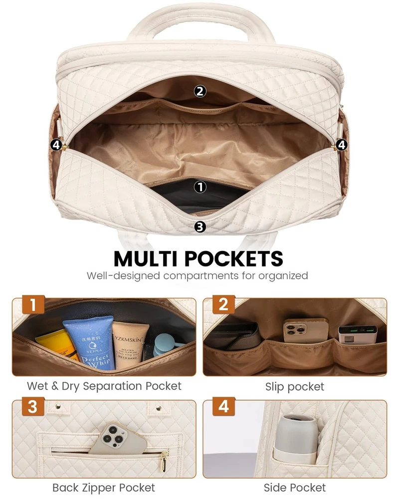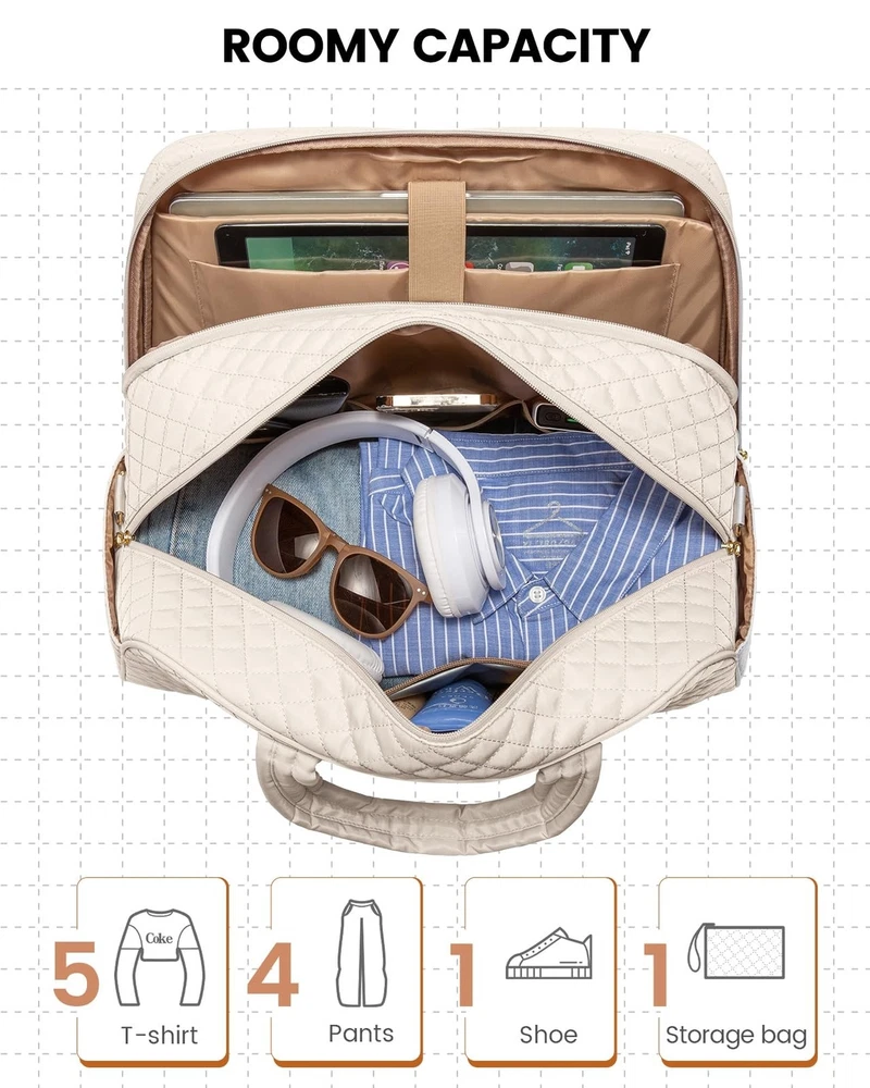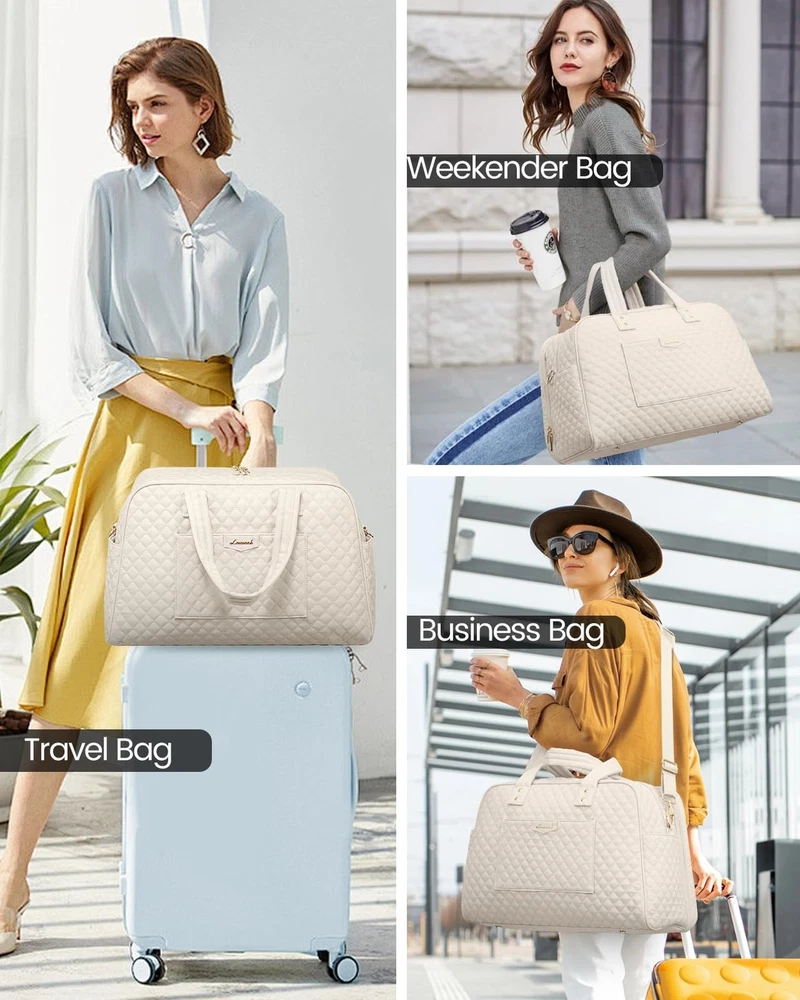 LOVEVOOK Travel Duffle Bag, Weekender Overnight Bag with Laptop Compartment for Women, Large Carry On Bag with Wet Pocket and toiletry Bag for Travel, Hospital, Business Trips, Sports, Beige Product Details Color: Beige Size: Large Brand: LOVEVOOK MPN: Does not apply UPC: Does not apply EAN: Does not apply Product Dimensions: 18 x 8 x 13 inches Item Weight: 2.25 pounds Department: Unisex Adult Manufacturer: LOVEVOOK Country of Origin: China Number of Compartments: 12 Large Capacity Designed to accommodate 3-5 days' worth of travel essentials. The carry on bag features a dedicated 15.6" laptop compartment for comprehensive protection of your electronics, while the main compartment offers ample space for clothing, toiletries, and shoes. Personal Item Travel BagMeasuring 18x13x8 inches, this design meets the personal item specifications of most major airlines such as Frontier, Spirit, and American Airlines. It fits comfortably under the seat, saving you from expensive checked baggage fees. Travel-Friendly Features Equipped with a separate toiletry bag, a wet-dry separation pouch, a convenient front quick-access pocket, and an integrated luggage sleeve, navigating airports has never been easier. Durable and Soft Material Made from a newly developed, soft fabric, this bag is ideally suited for use as a duffle bags, travel bags for women, duffle bag women, duffle bag for travel, carry on duffle bag or business laptop bag. Multifunctional Attributes Comes with a detachable shoulder strap, a luggage handle strap, and anti-theft zippers. Moreover, it serves as an ideal gift for family, friends, and partners.