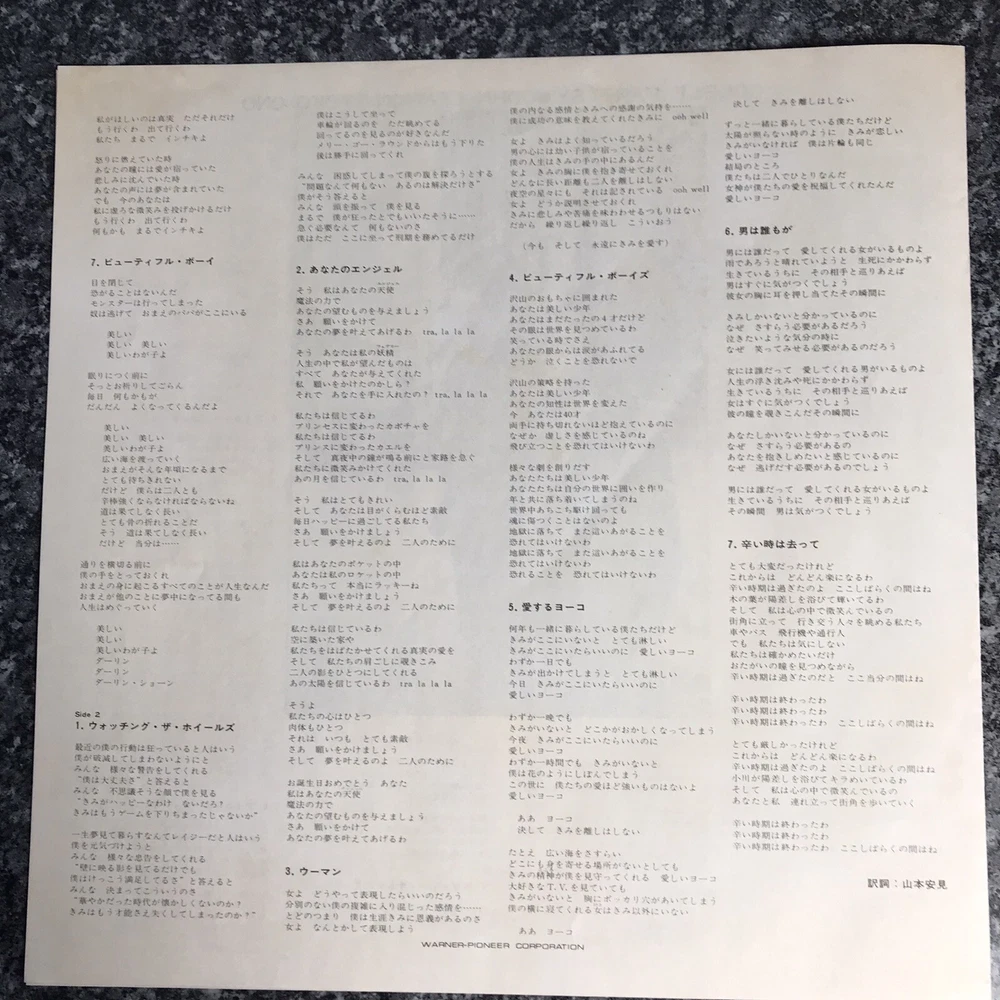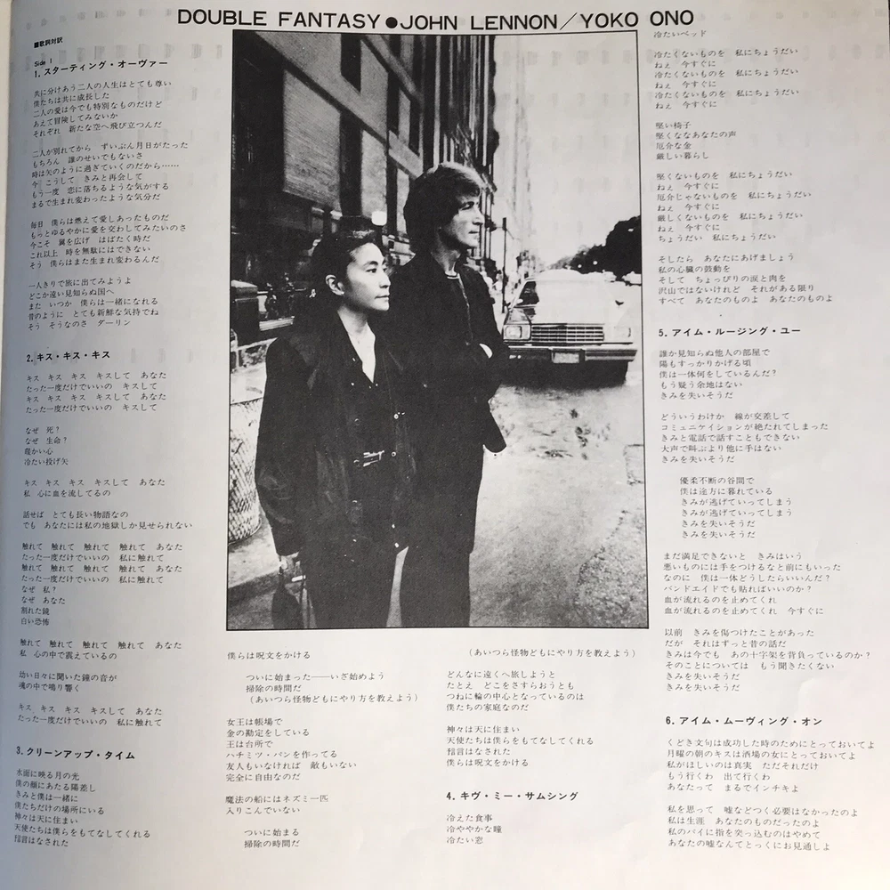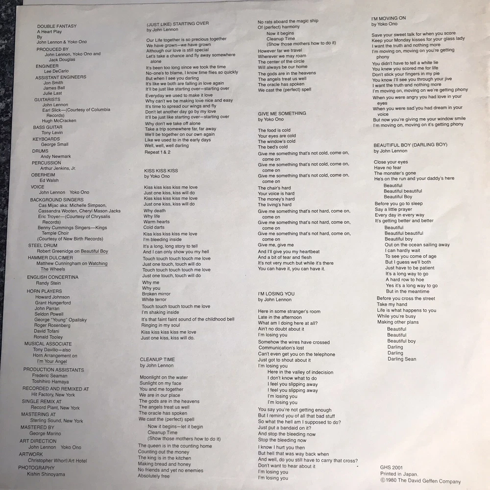 Track List A1 (Just Like) Starting Over Written-By, Lead Vocals [Uncredited] – John Lennon 3:55 A2 Kiss Kiss Kiss Written-By, Lead Vocals [Uncredited] – Yoko Ono 2:41 A3 Cleanup Time Written-By, Lead Vocals [Uncredited] – John Lennon 2:57 A4 Give Me Something Written-By, Lead Vocals [Uncredited] – Yoko Ono 1:34 A5 I'm Losing You Written-By, Lead Vocals [Uncredited] – John Lennon 3:58 A6 I'm Moving On Written-By, Lead Vocals [Uncredited] – Yoko Ono 2:19 A7 Beautiful Boy (Darling Boy) Steel Drums – Robert Greenridge * Written-By, Lead Vocals [Uncredited] – John Lennon 4:01 B1 Watching The Wheels Dulcimer [Hammer] – Matthew Cunningham Written-By, Lead Vocals [Uncredited] – John Lennon 3:59 B2 I'm Your Angel Arranged By [Horns] – Tony Davilio Written-By, Lead Vocals [Uncredited] – Yoko Ono 3:08 B3 Woman Written-By, Lead Vocals [Uncredited] – John Lennon 3:32 B4 Beautiful Boys Written-By, Lead Vocals [Uncredited] – Yoko Ono 2:54 B5 Dear Yoko Written-By, Lead Vocals [Uncredited] – John Lennon 2:33 B6 Every Man Has A Woman Who Loves Him Written-By, Lead Vocals [Uncredited] – Yoko Ono 4:02 B7 Hard Times Are Over Written-By, Lead Vocals [Uncredited] – Yoko Ono 3:20