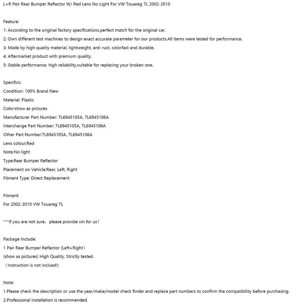 6L80 6L90 Transmission Rebuild 1-2-3-4 3-5-Reverse Clutch Seals Pack O-Rings 20.89 USD 21.99 USD Free shipping 5% off Valve Cover Gasket for VW Touareg Multivan T5 Transporter T5 2.5 TDI 070103469B 18.79 USD Free shipping 1PCS Fuel Injector 04E906036Q Fit Audi A3 Fit Seat Leon Fit Skoda Fit VW Passat 35.52 USD 37.79 USD Free shipping 6% off Exhaust Pipe Repair Kit 2-Stroke Dent Removal Orange For Honda Cr250 Cr250R 70.29 USD 73.99 USD Free shipping 5% off Air Filter Cleaner For Motorcycle Sportster 1200 Custom XL1200C Low XL883L USA 28.13 USD Free shipping Clutch Cable Replacement fit for Kawasaki ZR750 Zephyr 750 1991-2006 1995 1996! 15.95 USD 16.79 USD Free shipping 5% off 4x Carb Intake Manifold Boots For Suzuki GSXR750 GSX750F Katana 750 1898-1998 26.4 USD 27.79 USD Free shipping 5% off All Three Catalytic Converter Flex Y-Pipe Fits For Nissan Maxima 3.5L 2009-2014 179.39 USD Free shipping FUEL TANK CAP 51049-0003 FITS KAWASAKI VULCAN 500 800 1500 1600 1700 2000 W800 47.38 USD 49.87 USD Free shipping 5% off Front Sprocket Nut Lock Washer Tab Kit For YAMAHA R6 YZF 600 1000 TDM 850 16.03 USD 16.87 USD Free shipping 5% off Throttle Cable Wire Line Gas For Suzuki GSXR600/750 06-2009 GSXR1000 2005-2009 21.65 USD 22.79 USD Free shipping 5% off M16X1.5 Female Aluminum Weld On Fitting Bung SA 11.09 USD 11.67 USD Free shipping 5% off A Fantastic Shop Send us a message Our Store Seller Profile Feedbacks Save this seller Contact L+R Pair Rear Bumper Reflector W/ Red Lens No Light For VW Touareg 7L 2002-2010 L+R Pair Rear Bumper Reflector W/ Red Lens No Light For VW Touareg 7L 2002-2010 Feature: 1: According to the original factory specifications,perfect match for the original car. 2: Own different test machines to design exact accurate parameter for our products.All items were tested for performance. 3: Made by high quality material, lightweight, anti-rust, colorfast and durable. 4: Aftermarket product with premium quality. 5: Stable performance, high reliability,suitable for replacing your broken one. Specifics: Condition: 100% Brand New Material: Plastic Color:show as pictures Manufacturer Part Number: 7L6945105A, 7L6945106A Interchange Part Number: 7L6945105A, 7L6945106A Other Part Number:7L6945105A, 7L6945106A Lens colour:Red Note:No light Type:Rear Bumper Reflector Placement on Vehicle:Rear, Left, Right Fitment Type: Direct Replacement Fitment: For 2002-2010 VW Touareg 7L ***If you are not sure,please provide vin for us! Package Include: 1 Pair Rear Bumper Reflector (Left+Right) (show as pictures) High Quality, Strictly tested. (Instruction is not inclued!) Note: 1.Please check the description or use the year/make/model check finder and replace part numbers to confirm the compatibility before purchasing. 2.Professional installation is recommended. About US About Our Items We strive to describe all items accurately and thoroughly, with the utmost care and attention to detail. However, to ensure a mutually satisfactory transaction, we kindly ask for your assistance in thoroughly reviewing the item description and photos, and addressing any questions before placing a bid. Customer Satisfaction We stand behind our commitment with exceptional service, a 100% money-back guarantee, and a dedication to customer satisfaction. I am readily available to address any inquiries or concerns you may have, both before and after your purchase. Our aim is to ensure your shopping experience is enjoyable and that you're delighted with your purchase. Feedback Your feedback is crucial to our business's success. If you're satisfied with your purchase and the service you received, we would greatly appreciate your positive feedback, along with an overall Detailed Selling Rating (DSR) of 5. Please take a moment to leave us positive feedback. Our eBay account is set up to automatically reciprocate positive feedback once yours is received. If you're considering leaving neutral/negative feedback or opening an eBay/PayPal case, we encourage you to reach out to us immediately. We're committed to resolving any issues to the best of our ability. Shipping Parcel will be shipped using Standard shipping method. For security purposes, items will be shipped exclusively to the confirmed address on Paypal. Please ensure your Shipping address is up to date before proceeding with payment. Estimated delivery time within the United States ranges from 3 to 10 business days, depending on your location. Returns We accept returns within 60 days from the date the buyer receives the item. If the item is found to be defective upon receipt, the customer has up to 30 days from the date of receipt to request an exchange for a new item or a refund. For returns due to a change of mind, we accept items in their original selling condition. However, if the package has been opened due to a mistaken order, it does not qualify for our return policy. Please note that the buyer is responsible for covering the cost of return postage. If you encounter any issues, please reach out to us via eBay message, and we'll respond within 24 hours. Left Rear Bumper Tail Lamp Fog Lamp Assembly 4M0945095A For AUDI Q7 2016-2023 75.87 USD Free shipping Right Rear Bumper Tail Lamp Fog Lamp Assembly 4M0945096A For AUDI Q7 2016-2023 75.87 USD Free shipping Rear High Mount Brake Stop Light Lamp For FIAT 500 CONVERTIBLE 2009-2018 52.87 USD Free shipping 2x Left+Right Inner Trunk LED Tail Light Lamp For AUDI A6 C7 2012-2015 169.87 USD Free shipping Tail Light Bulb 1943373 For GMC Acadia 2013-2017 36.99 USD Free shipping 2x High Level 3rd LED Rear Brake Light For Ford Transit Tourneo Custom Barn Door 37.79 USD Free shipping For BMW 5-series F10/F18 Tail Fog Lamps Light Rear Bumper Reflector 2010-2013 21.79 USD Free shipping 2PCS Rear Tail Lights Lamps For Toyota Tacoma 2001-2004 W/Bulbs 95.99 USD Free shipping Rear Left Bumper Reflector Lamp 4M8945701 For Audi Q8 RSQ8 SQ8 2019-2022 43.73 USD Free shipping High Level 3Rd Tail Light Brake Lamp 13188045 For Vauxhall Corsa D E 5-D