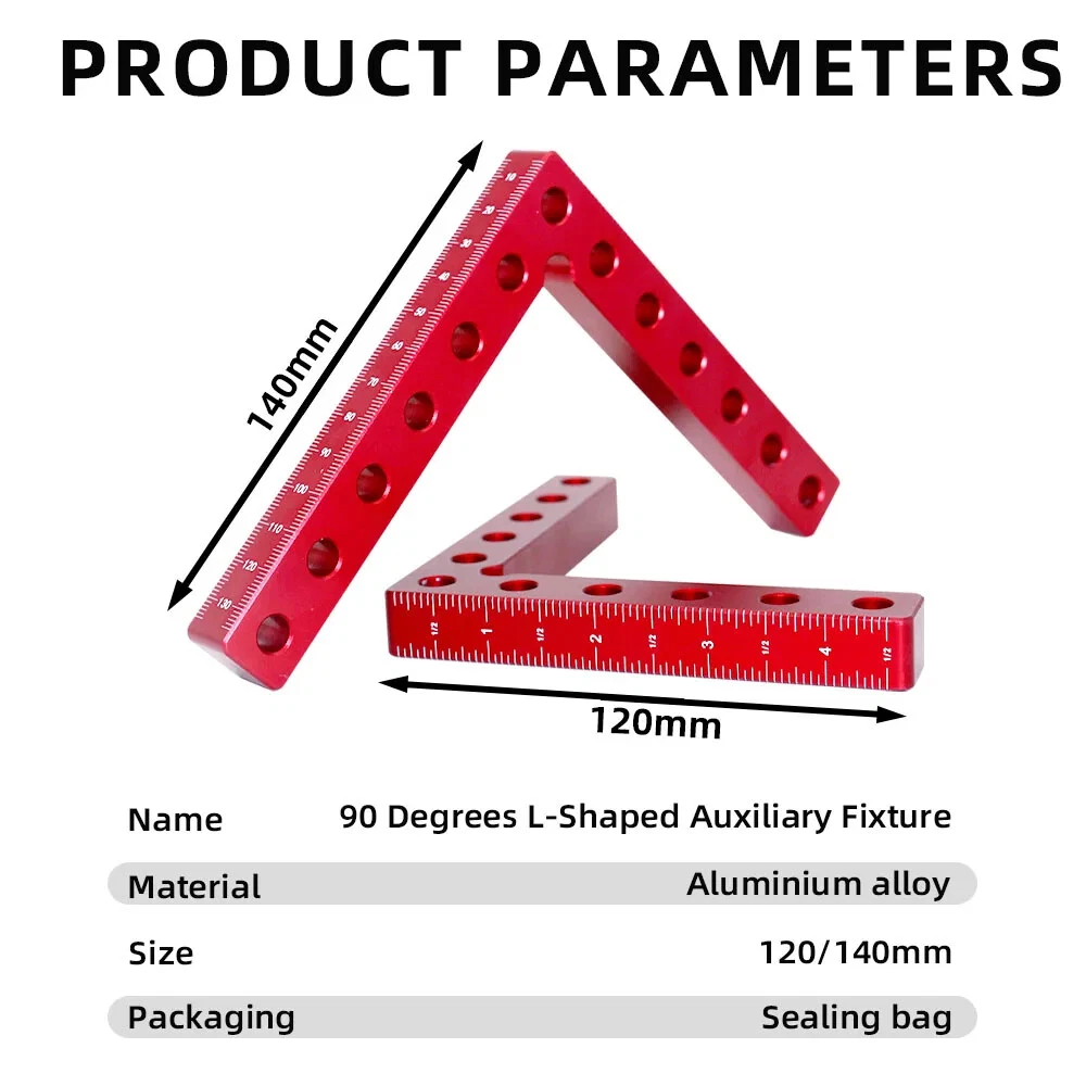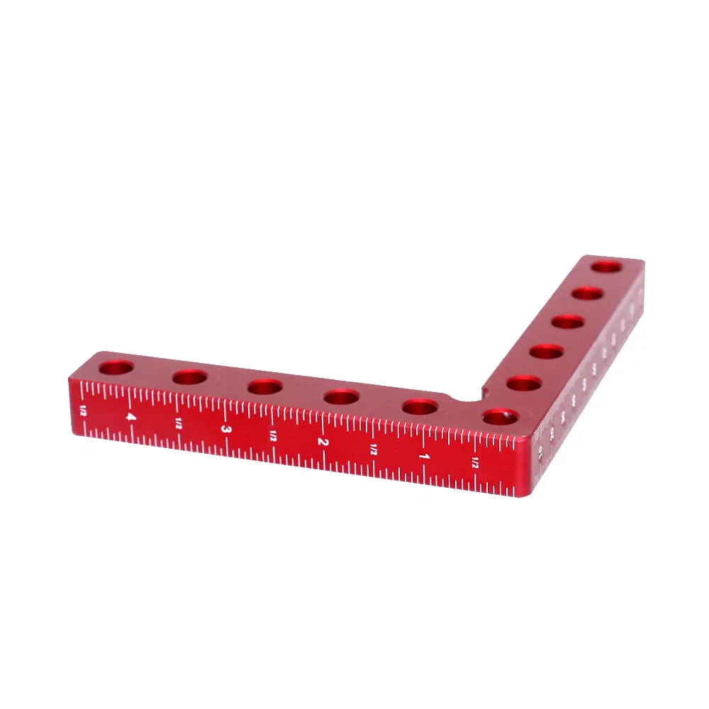 【Premium Material】Made of aluminium alloy, it will lasts for years. Anodized red surface, durable and resistant to corrosion, rust prevention. 【L-Type Design】L-Type positioning square, with accurate metric/inch scale and different fixing holes, is convenient for you to measure length, position, etc. 【Easy To Use】Beveled edges, Perfect 90° Corners, easy to handle and will not damage the fragile cutting edges, just place a square on the corner of the two stock pieces to square and secure with a set of clamps. Excellent ergonomic design for gripping power which can help to set up quickly, providing you a comfortable and safe using process. 【Wide Application】This Carpentry right angle jig set designed to be clamped to boxes, picture frames, drawers,frames, shelf cabinets, 90 degree weld and for outside corners. Practical DIY tool to make your woodworking project easier. 【What You Get】4* Positioning Squares and 8* Clamp Hooks