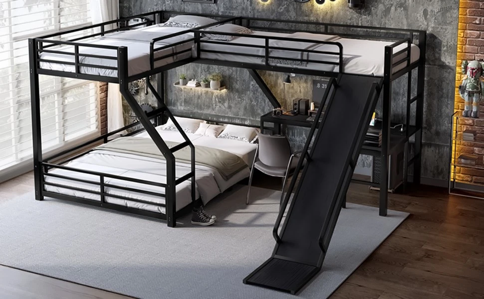 L-Shaped Metal Triple Bunk Bed Twin XL over Queen Bed Frame w/Twin Size Loft Bed Features 【Space-Saving Triple Bunk Design】This metal triple bunk bed combines a twin xl over queen and a twin loft, offering three sleeping spaces in one compact frame. Perfect for large families, sleepovers, or guests, it maximizes vertical space while keeping your bedroom neat and organized. 【Fun Slide & Modern Touch】Equipped with a detachable slide, this queen over twin bunk bed adds an element of play and excitement for kids. Plus, integrated USB ports allow convenient charging for phones, tablets, or other devices, combining fun with everyday functionality. 【Sturdy & Stable Metal Frame】Crafted with a heavy-duty steel frame, this triple bunk bed ensures long-lasting durability and stability. Reinforced metal slats provide reliable mattress support, eliminate the need for box springs, and reduce sagging for years of comfortable use. 【Noise-Free & Safe Design】The twin and twin XL over queen bunk bed is equipped with full-length guardrails, secured ladders, and anti-noise rubber plugs to ensure safety and a quiet night’s sleep. Ideal for both kids and adults, offering peace of mind and comfort. 【Easy Assembly with Instructions】This triple bunk bed with slide and USB ports comes with all the tools and illustrated instructions needed for quick setup. Clearly labeled parts make assembly simple, so you can enjoy a functional, stylish, and secure bed with ease. Descriptions Product Description Upgrade your bedroom with this Twin XL and Queen over Twin Metal Triple Bunk Bed with Slide and USB Ports, a perfect blend of space-saving design, fun features, and modern convenience. With three sleeping areas— twin, twin XL, and a queen bed—this triple bunk is ideal for large families, shared rooms, or hosting overnight guests. The detachable slide adds a playful touch for kids, while built-in USB ports make charging devices effortless. Crafted from a sturdy steel frame with reinforced slats, it delivers strong mattress support without needing a box spring. Safety is prioritized with full-length guardrails, secure ladders, and noise-reducing rubber plugs for a quiet, restful sleep. Its sleek black finish complements any room style, while the included instructions and tool kit ensure easy assembly. This bunk bed combines practicality, durability, and modern design to make the most of your living space. Weight & Dimensions Product Type Metal Triple Bed Color Black Size Twin XL/Queen Material Metal+MDF Overall Product Dimension 117.72”L*82.68’’W*57.08”H Overall Product Weight 177.70 LBS Weight Capacity 500LBS Number of Each Bed Slats 19pcs for Twin, 20pcs for Twin XL&Queen Recommend Mattress Thickness 6'' for Upper Bed,8'' -10''for Bottom Bed Number of Package 3 Package Dimension & Weight Please refer to the Specification Level of Assembly Full Assembly Needed Eligible for Hardware Packs Yes Country of Origin China Note All the pictures are taken by actual samples, slight chromatic aberration may occur due to lighting or display.