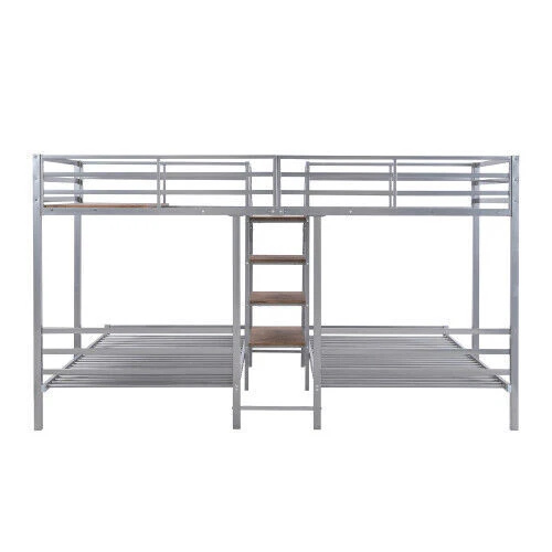 L-Shaped Triple Bunk Bed with Stairs, Metal Twin Over Twin & Twin Bunk Bed Features [Sturdy Metal Frame] Made of solid metal frame, the bunk bed is durable and reliable for you bedroom.Surrounding with high guardrail on upper bed, no need to worry about safety when sleep alone. [Space Saving Design] Three beds in one, while this bed provides a solution for multi-person accommodation, it also greatly saves space. [Multiple Storage Space] The 4-tier shelf is both a storage shelf and a staircase. The upper bed also comes with a 21.3" x 39" plank where you can put toys and more. Theres spacious space under the down beds. [No Box Spring Required] The slats support the mattresses not to slide and increase the service life. [Easy Assembly] All parts included in your package are indicated clearly. With step-by-step installation manual and per-drilled holes, you can easily assemble this bed individually. Manual installation is recommended. Description Metal Twin over Twin & Twin Bunk Bed, Triple Bunk Bed with Storage Shelves Staircase, Black This metal bunk bed features three beds in one, truly a space-saver. With a twin size bed on top and two twin size beds underneath, this bed is ideal for accommodating guests and sleepovers, and also perfect for family with multiple members. The staircase between beds is available for storage and the down bed is 10.4" off the floor, so there's spacious space under the down beds, you can use it to store your stuff. The top bed is equipped with full-length guardrail, keeping user's safe from falling. Coming with great quality and multiple function, this bed will be the best addition to your bedroom. Description Material Metal+MDF Size Twin Color Black Numbers of Package 2 Spring Box No need Assembly Required Yes Origin China Dimensions Overall Product Dimension 101.2''L x 77.4''W x 57.8''H Package Dimension Please refer to the Specification Upper Bed 76'' x 39'' Down Bed 75.2'' x 39.2'' Total Height 57.8'' Number of Bed Slats(Upper/Down) 22pcs/22pcs/22pcs Recommend Mattress Thickness of Bed(Upper/Down) 6''/8-10'' Overall Product Weight 180lb Bed Weight Capacity(Upper/Down) 300lb/300lb