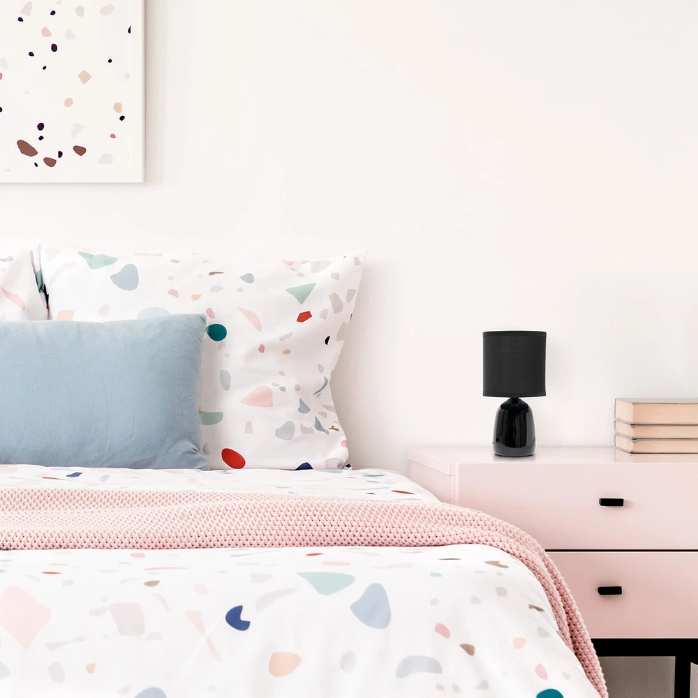 A traditionally styled table lamp base solid in the color of your choice is paired with a matching fabric drum shade. It's perfectly designed to sit on the nearest table, nightstand, college dorm or office desk. Sometimes, a timeless styled lamp is all you need for a final touch in designing your ideal space! TRADITIONAL DESIGN: A timeless style lamp in a thimble shaped base and a matching TC fabric shade is the perfect lighting addition to your space and can compliment almost any décor style! ACCESSIBLE SWITCH: An easily accessible gear (rotary) switch is located on the cord of this table lamp to allow a quick and easy on/off function as needed. Lamp is also equipped with a 5 foot black plug in cord rooted at the base. PRODUCT SIZE: Overall product size is L: 5.12" x W: 5.12" x H: 10.04" and weighs 0.77 lbs. The shade of this lamp measures Dia: 5.12" x H: 5.2". LAMP IS A MINI LAMP. ASSEMBLY & USE: Product ships assembled and will only require you to secure the lamp shade to the base using the provided socket nut prior to use. BULB REQUIREMENT SOLD SEPARATELY: This table lamp uses 1 x 40 watt equivalent type B10 E12 candelabra base bulb, which is not included in your purchase but can be easily found online or your local hardware .