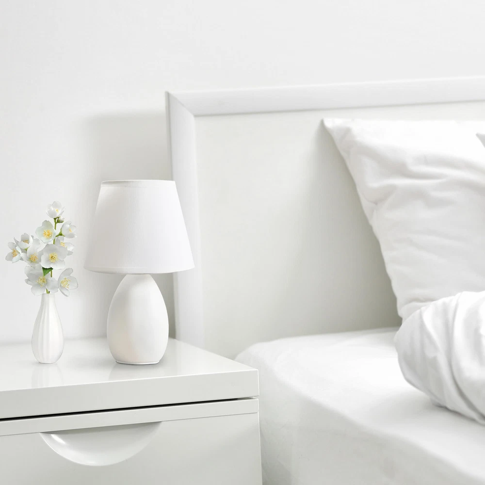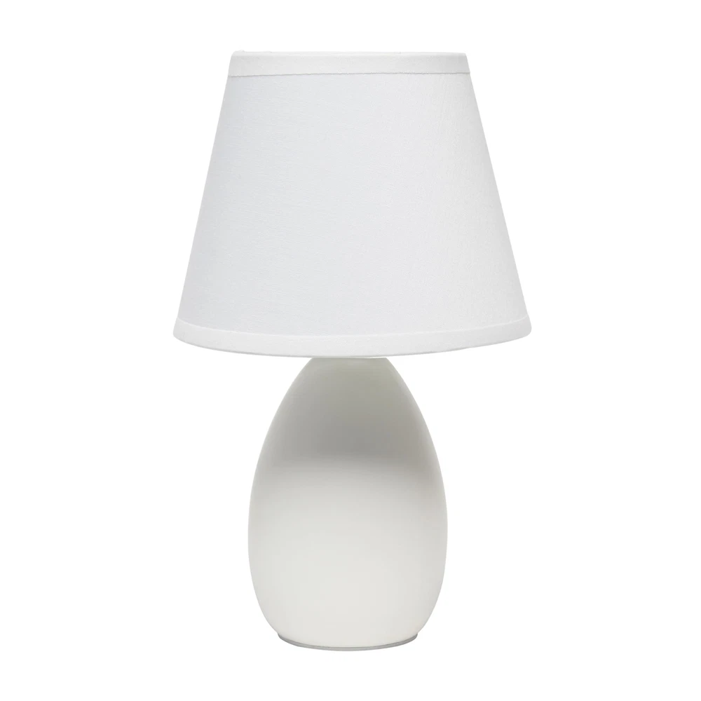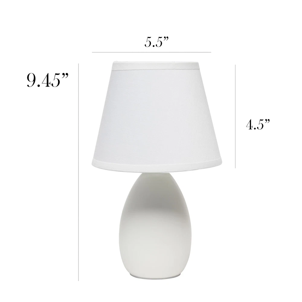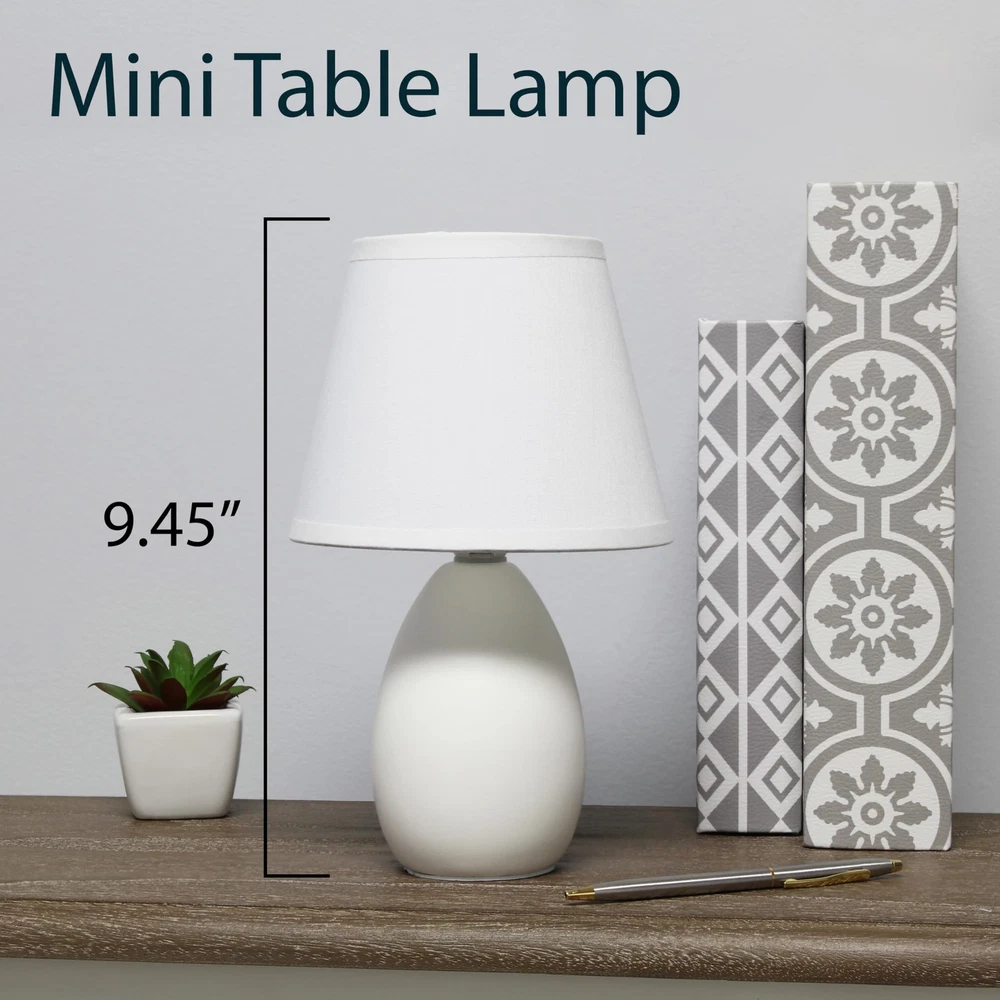 The 9.45" Chic and Sleek Oblong Mini Oval Ceramic Table Lamp offers a stylish lighting solution with its modern and elegant design. Featuring a smooth, oblong oval ceramic base, this lamp adds a refined touch to any tabletop. Its compact size is perfect for smaller spaces, making it an ideal choice for bedside tables, desks, or accent areas. The sleek lines and chic finish of the lamp enhance its versatility, seamlessly fitting into various interior styles. With its combination of functionality and style, this mini lamp provides a sophisticated glow that enriches your living space. CHIC OBLONG OVAL DESIGN: Features a sleek, oblong oval ceramic base that adds a modern and stylish touch to any room. MATCHING SHADE: Comes with a coordinating shade that complements the base and provides a soft, diffused light. STYLISH ACCENT PIECE: Adds both functionality and a touch of sophistication to any room, making it a delightful addition to your space. EASY TO USE: Convenient on/off switch on cord for effortless operation. BULB REQUIREMENT: This table lamp uses 1 x 40-Watt equivalent Type B E12 candelabra base bulb (not included).