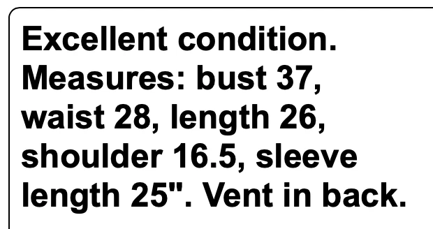 Excellent condition. Measures: bust 37, waist 28, length 26, shoulder 16.5, sleeve length 25". Vent in back. THANK YOU EBAY!!! We are so thankful for our customers! We have thousands of listings, and therefore receive hundreds of messages, every single day. So, if you are asking about a price drop, or a shipping price drop, or asking for extra measurements, or to add additional photos, please allow me to answer you here, No thanks. If your question is not one of those questions, we will be happy to answer you individually. YES...WE DO COMBINE DOMESTIC SHIPPING. Extra jewelry items ship for $2 each (except for large jewelry lots). We will refund the difference as we are mailing out.....we hope you enjoy shopping with us! We encourage you to read the description and check all photos.
