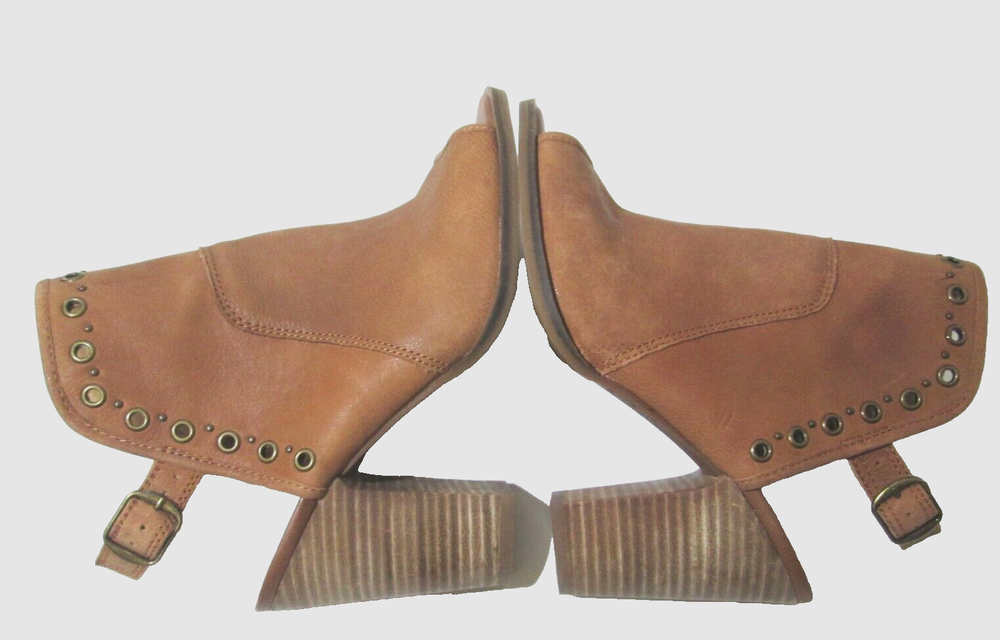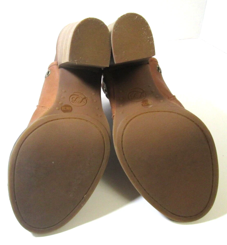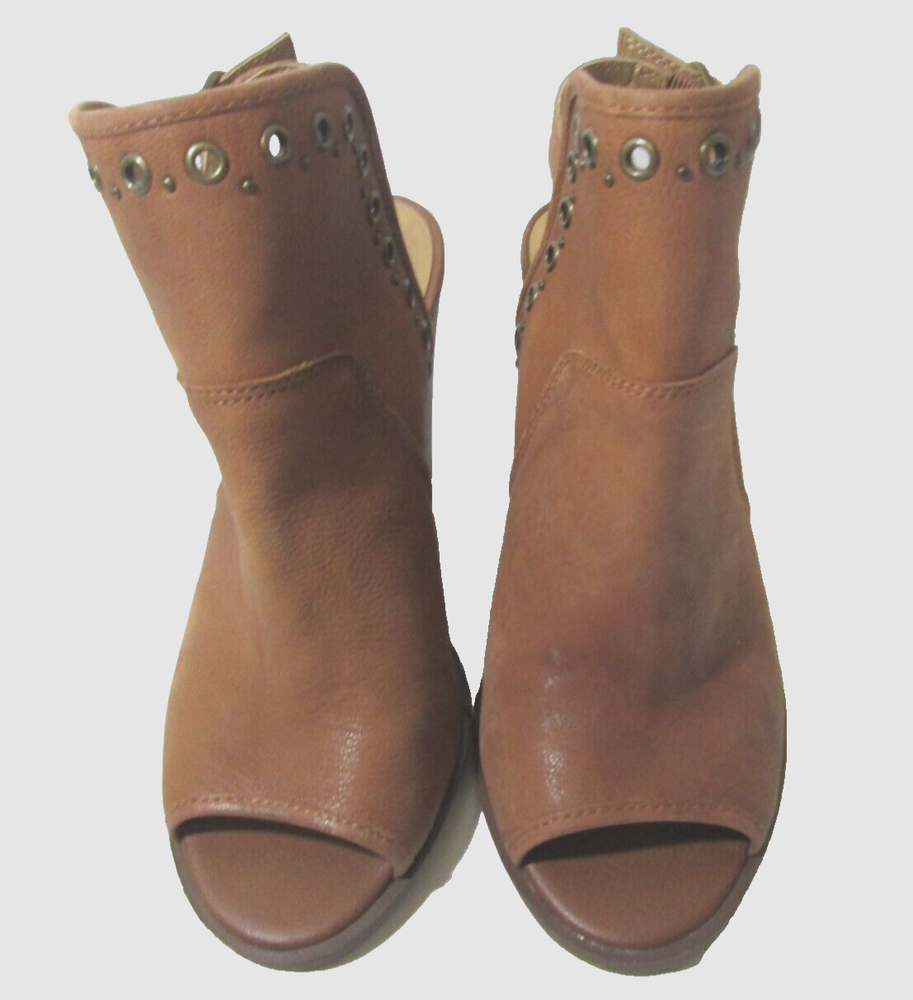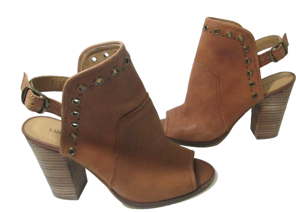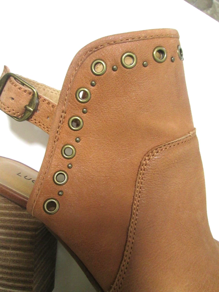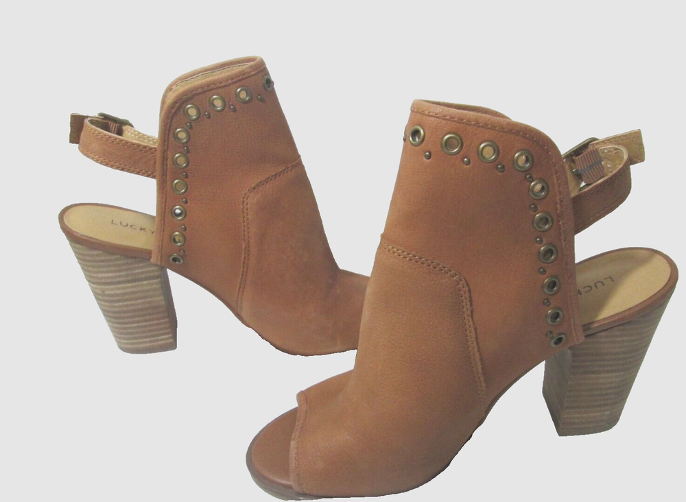 Complete your outfit with these Lucky Brand Lorillar brown leather booties. The peep toe and ankle strap closure make them perfect for any occasion, whether you're traveling, attending a wedding or cocktail party, or just going about your daily business. The stacked heel provides a comfortable 4" lift and the brass eyelets and studs add a touch of style. These Lorillar booties are made of leather and manmade materials, and have a solid pattern with a brown color. They come in a standard shoe width and size 8 US (6 UK, 38 EU). The Lucky Brand Lorillar booties are the perfect addition to any shoe collection!
