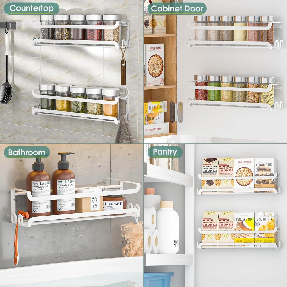 Premium spice rack cabinet door spice rack set is stylish and fits any decor in your kitchen or pantry. Made of sturdy iron with a finish, it's durable and keeps your space sleek and organized. Stable Guardrail & Wider Adhesive Stickers - Our spice rack organizer for cabinet door added side guards and improved two-in-one wider adhesive stickers for increased safety and stability. The adhesive spice racks have guard rails prevent spice from falling, while the wider and stronger stickers provide extra protection and peace of mind in your busy kitchen Sturdy Spice Rack with 16 Hooks - The premium metal cabinet door spice rack is meticulously crafted with powder-coating for enhanced durability and rust resistance. The pantry door spice rack organizer comes with 2 hooks on both sides(4 pack total 16 hooks), so you can easily hang bottle openers, scissors and some other light items.Purpose-built to ensure practicality, versatility, and strength, our wall mount spice rack for cabinet door can be safely used in domestic and commercial spaces Two-Installation Options - Our spice rack organizer for cabinet door has two installation methods: punch-free and perforated, free choice, convenient and quick. Wall mount spice rack Equipped with two different sizes of screws, which can be firmly fixed on the wall (thin doors/hollow doors are not recommended); the cabinet spice organization are also strong adhesive stickers that provide a drill-free suspension solution, which is easy Install without damaging the wall or door(best for flat surfaces) Ideally Sized Spice Organizer - 2.36x2.75x12 inch, Each hanging spice rack shelf provides space for regular sized spice jars (up to 2" ). The cabinet door spice rack organizer has closed sides to keep glass spice jars from falling out either end. Keep your seasoning perfectly organized with the wall mount spice rack & enjoy easy access at all times Hang Just About Anywhere - The small spice rack organizer for cabinet door can be mounted on your wall, inside your stove or pantry/cabinet door, bathroom, or RV. Experience the choice according to your needs with these space-saving wall mount spice rack. The cabinet door spice organization features a straight forward and functional design that can easily complement any space