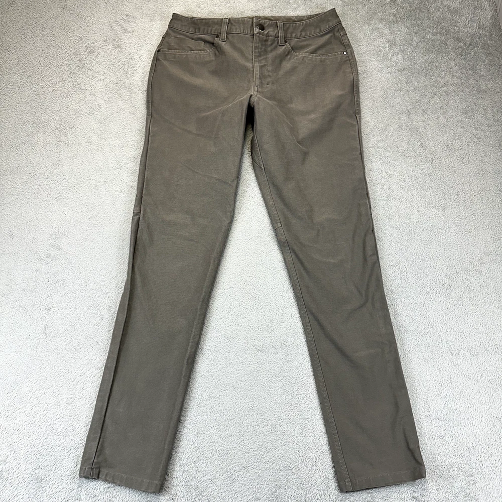 Product Line: ABC Pant Fabric Type: Canvas Handmade: No Features: Stretch Occasion: Business, Casual, Workwear Style: Chino Size: 31 Theme: City, College, Hipster, Logo, Preppy Personalize: No Material: Cotton, Elastolefin, Polyester Waist Size: 32 in Closure: Button, Zip Vintage: No Type: Pants Color: Gray Pattern: Solid Pocket Type: 5-Pocket Design Department: Men Fit: Slim Rise: Mid (10-12 in) Size Type: Regular Accents: Five Pocket Design Brand: Lululemon Garment Care: Machine Washable Season: Fall, Spring, Summer, Winter Leg Style: Straight Inseam: 30 in Front Type: Flat Front