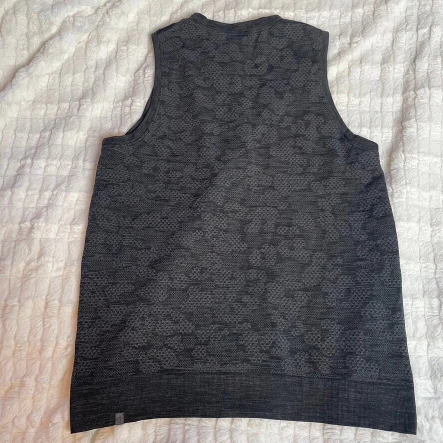 LULULEMON Breeze By Muscle Tank Top Small Polar Spots Titanium / Black No size tag From long runs to circuit reps, catch your cool in this seamless, anti-stink tank. Open-hole ventilation allows for plenty of airflow when your workout heats up. SILVERESCENT® TECHNOLOGY Silverescent® technology, powered by X-STATIC®, inhibits the growth of odour-causing bacteria on this garment anti-stink Features Designed for: Run No chafe: Seamless construction in the body minimizes chafing No ride up: Wider hem helps your shirt stay put Relaxed fit, hip length: Layers easily and gives you room to breathe Excellent condition