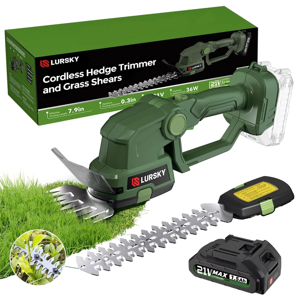 Effortless Cordless Operation:LURSKY's cordless hedge trimmers offer hassle-free use with no cords or gas required. The long blade is perfect for thin shoots on hedges, bushes, small trees, and ornamental plants, while the short blade is ideal for cutting grass, weeds, and small lawn areas. The 21V Hedge Trimmer, powered by a 1.5Ah lithium battery, provides cordless convenience for light garden trimming tasks, making yard maintenance effortless Dual-Function Design: LURSKY's electric hedge trimmer and grass shear boast a seamlessly integrated design. With blade release buttons enabling effortless transitions between functions, the 4-inch blade is tailored for lawn maintenance (max cutting thickness 3/8in.), while the 8.89-inch blade (max cutting thickness 1/4in.) excels at precise trimming of hedges and shrubs Safety First:Our safety-centric approach sets us apart, featuring an additional shield to prevent garden debris from causing any harm. With dual safety locks, a safety switch, and upper trigger lock-out, accidental starts are effectively prevented. Plus, our dual heads come equipped with high-quality covers, ensuring both your safety and the protection of the blades. Trim with confidence, knowing that safety is our utmost priority Durable and Portable Design:LURSKY's Hedge Trimmer offers easy single-handed operation for extended use. The ergonomic handle ensures a comfortable grip, making it a compact and flexible tool for small gardening tasks.Cordless grass shears feature an adjustable machine head with 3 angles (15°, 30°, and 45°) for cutting grass in tight areas, providing a comfortable mowing experience, reducing strain on the back and shoulders, and customizing mowing based on terrain and grass height Perfect Present for Gardening Enthusiasts:Great for keeping lawns, gardens, and outdoor spaces pristine. Ideal for homeowners, gardeners, landscapers, and gardening enthusiasts. Perfect for gifting on birthdays, housewarmings, Father's Day, Mother's Day, Thanksgiving, anniversaries, Valentine's Day, and Christmas Advanced Battery Technology: LURSKY's Hedge Trimmer, when fully charged, provides continuous use for 50-70 minutes. Featuring a rechargeable 1.5Ah lithium battery with a quick 2-hour charge time, this trimmer ensures uninterrupted garden pruning. The battery's capacity directly impacts cutting performance, so it's recommended to fully charge it before the first use. With a detachable design and battery level indicator, this tool offers reliability and efficiency for all your landscaping needs Effortless Efficiency:Experience the power and versatility of the LURSKY trimmer. A robust motor delivers a whopping 1200 strokes per minute, ensuring you can breeze through even the most demanding trimming jobs. Featuring an adjustable head with three distinct angle settings, this innovative trimmer offers exceptional maneuverability, allowing you to reach and trim grass in tight spaces and under landscaping obstacles that a traditional mower can't access