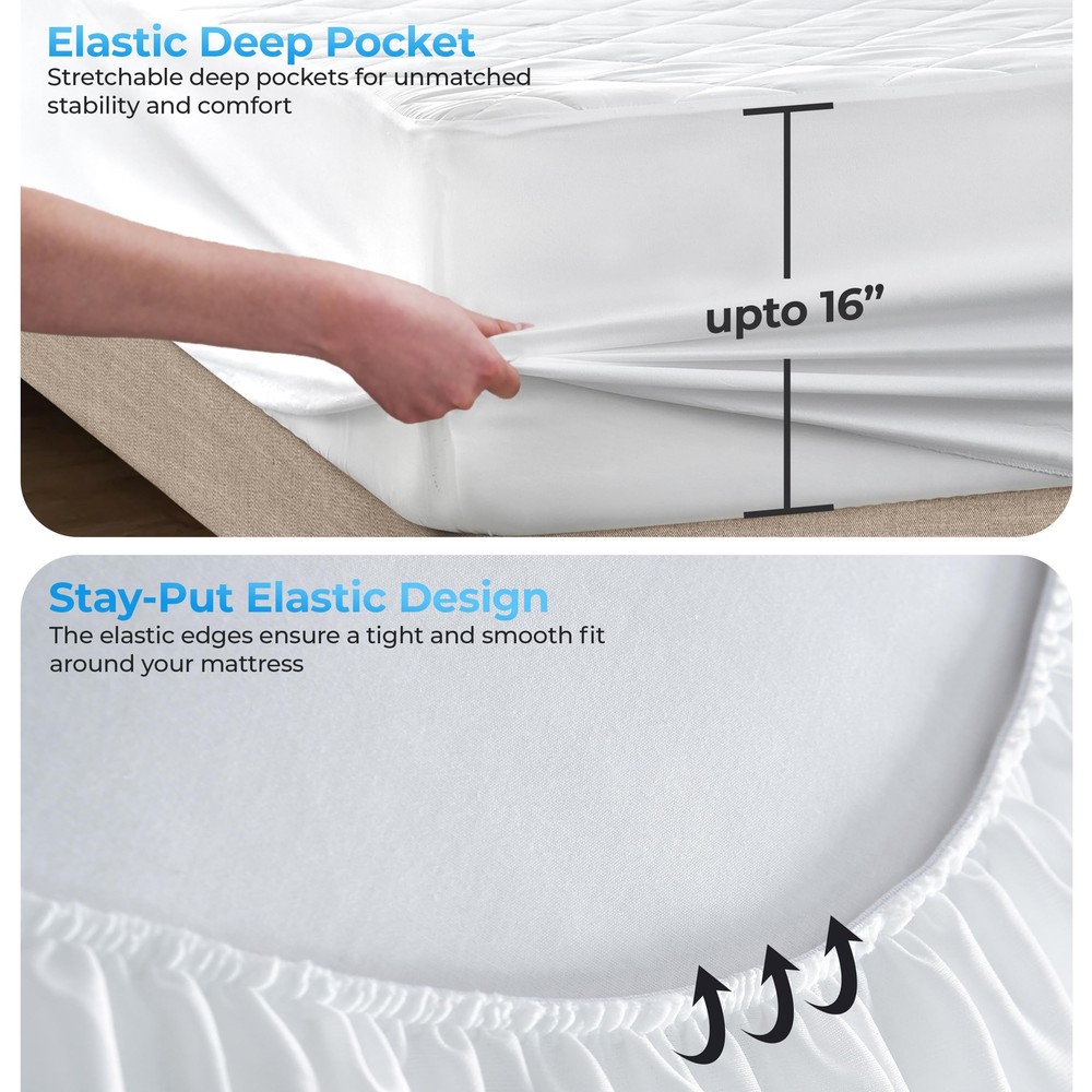 This mattress pad is a game-changer for a cozy night’s sleep! The ultra-soft microfiber feels amazing against the skin while keeping me cool all night. The quilted design stays perfectly in place, and I love that it’s completely silent—no crinkly sounds like other protectors. It fits my king bed snugly and adds just the right amount of plush comfort without overheating. Washing is a breeze, and it comes out looking brand new every time. Definitely worth it for the quality and comfort!