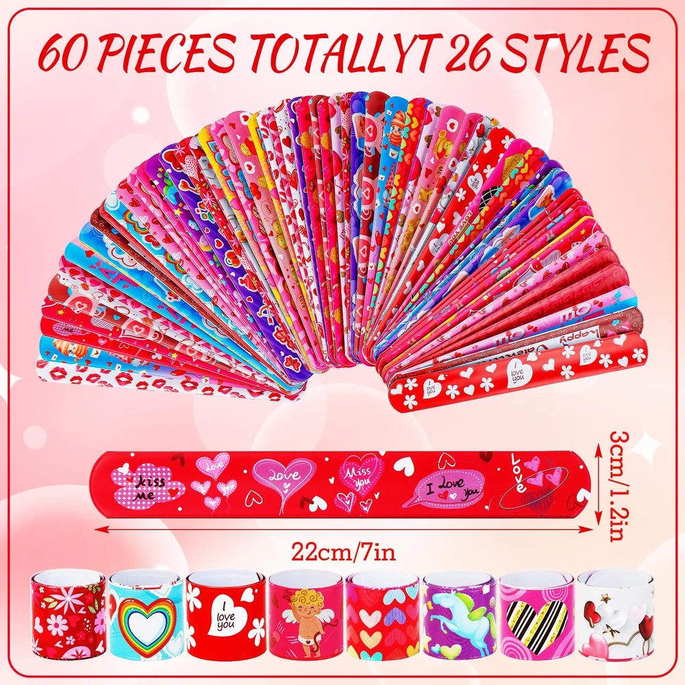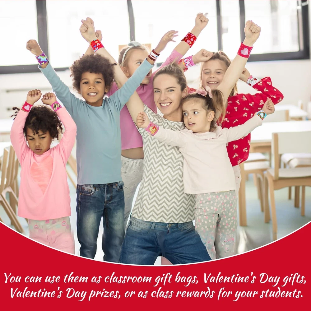 LUYI 60 Pcs Valentines Day Slap Bracelets Wristbands Valentines Day Gifts for Kids Party Supplies Toys School Class Classroom Exchange Birthday Game Prizes Goodie Bag Fillers Product Details Style: 60--SlapBracelets Brand: LUYI MPN: 1 UPC: Does not apply EAN: Does not apply Color: Red,pink Material: Alloy Steel Brand: LUYI Theme: Love Occasion: Valentine's Day Manufacturer: LUYI Age Range (Description): Kid Package Dimensions: 9.09 x 5.83 x 0.67 inches Item Weight: 15.2 ounces Country of Origin: China Department: Unisex VALENTINES DAY GIFTS FOR KIDS:Newest 60 pcs Valentines slap bracelets variety of patterns are printed on the surfaces of the valentine snap bracelets bulk,such as the pattern of heart,mermaid,donut,gift boxes,sweet and warm words,come with bright colors,it must be a hit and will add great fun to your Valentines party favors Unique Valentines Designs:Total 60pcs Valentines slap bracelet toys with 25 different styles,they are all made of quality non-toxic paper pulp, make sure it is safe.Ideal Valentine notes IDEAL Valentines day Gifts:Happy Valentine's Day - Valentines party favors set is suitable for classroom school gift exchange,valentines day gift exchange,valentines day cards gifts,valentines toys,give away,student awards,classroom game prize,birthday party and so on.Spend a beautiful Valentine's Day Easy to Wear:Just simply slap the bracelet on your wrist,it will form a comfortable fitted grip based on your wrist size.You can also stack them up, collect them,it will become a special valentines day gift decor or fun party supplies.fit all wrists Premium Material:The valentines slap bracelets are made of durable metal core inside.These valentines party favors for kids are tightly wrapped with soft PVC material on the outside,which is safe for children wearing