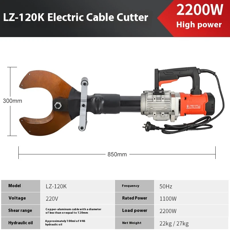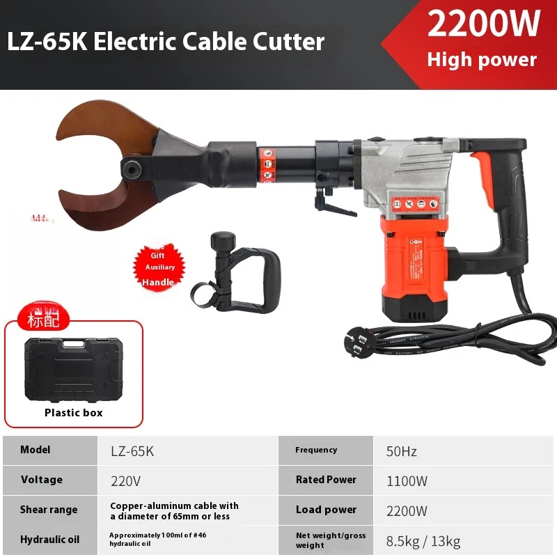 2200W LZ-65 Electric hydraulic cable cutter plug- in hydraulic cable cutter multifunctional steel strand cutting for pliers Product name: High power cable cutter Model LZ-65K Frequency 50Hz Voltage 220v Rated power 1100w Cutting range ��65mm copper and aluminum cables Load power 2200w Hydraulic oil 46# hydraulic oil about 100ml