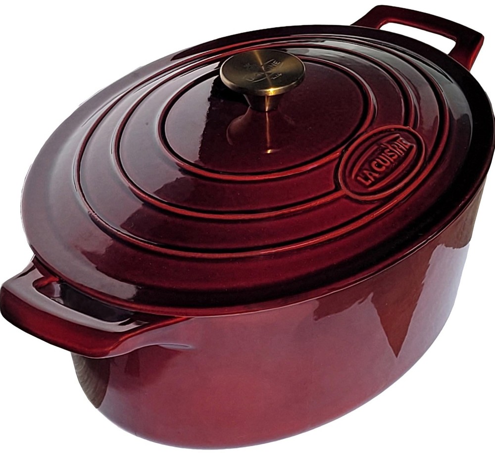 Our La Cuisine series is a range of classically, designed by the much lauded Marcus Notley, that is aesthetically beautiful, with gorgeous colors. Our Pro-Range (Interior Matte Black Enamel coating finish)is by using state of the art Japanese enamel glaze, that allows a patina to develop on the surface, with time it develops non-stick properties, the more it is used the better it gets. Our Cast Iron cookware is intrinsically safe and, even at high temperatures, doesn’t emit any dangerous toxins. It also retains its composition and shape under extreme conditions, unlike some softer materials. PATENTED SURE-GRIP, WIDE-ANGLE WEDGES PROFILE HANDLES for the most secure and comfortable grip possible. Golden-Plated #304 Stainless Steel Knob SUPER TOUGH INTERNAL COARSE MATT BLACK ENAMEL COATING FINISH: Scratch and stain resistant, it is also designed to withstand high temperatures, up to 500°F. The internal coarse matt black surface enhances grease absorption during cooking, allowing a patina to develop over time. As the patina builds, the cast iron Dutch oven naturally acquires non-stick properties—the more you use it, the better it performs. 3 LAYERS PORCELAIN ENAMEL COATING EXTERIOR: Extremely durable and resistant to colorization. Easy to clean and perfect for transferring directly from the kitchen to the table. MULTI-FUNCTIONAL: Ideal for searing meat, broiling, braising, sautéing, simmering on the hob, as well as baking and roasting. C𝐀𝐒𝐓 𝐈𝐑𝐎𝐍 𝐈𝐒 𝐅𝐔𝐍𝐃𝐀𝐌𝐄𝐍𝐓𝐀𝐋𝐋𝐘 𝐀𝐁𝐎𝐔𝐓 𝐒𝐎𝐋𝐈𝐃𝐈𝐓𝐘: Offers excellent heat retention, even heat distribution, and flavor enhancement. Absolutely perfect for dishes that require slow cooking. COMPATIBLE WITH ALL STOVETOPS Includes induction, ceramic, halogen, and gas.