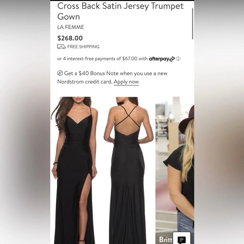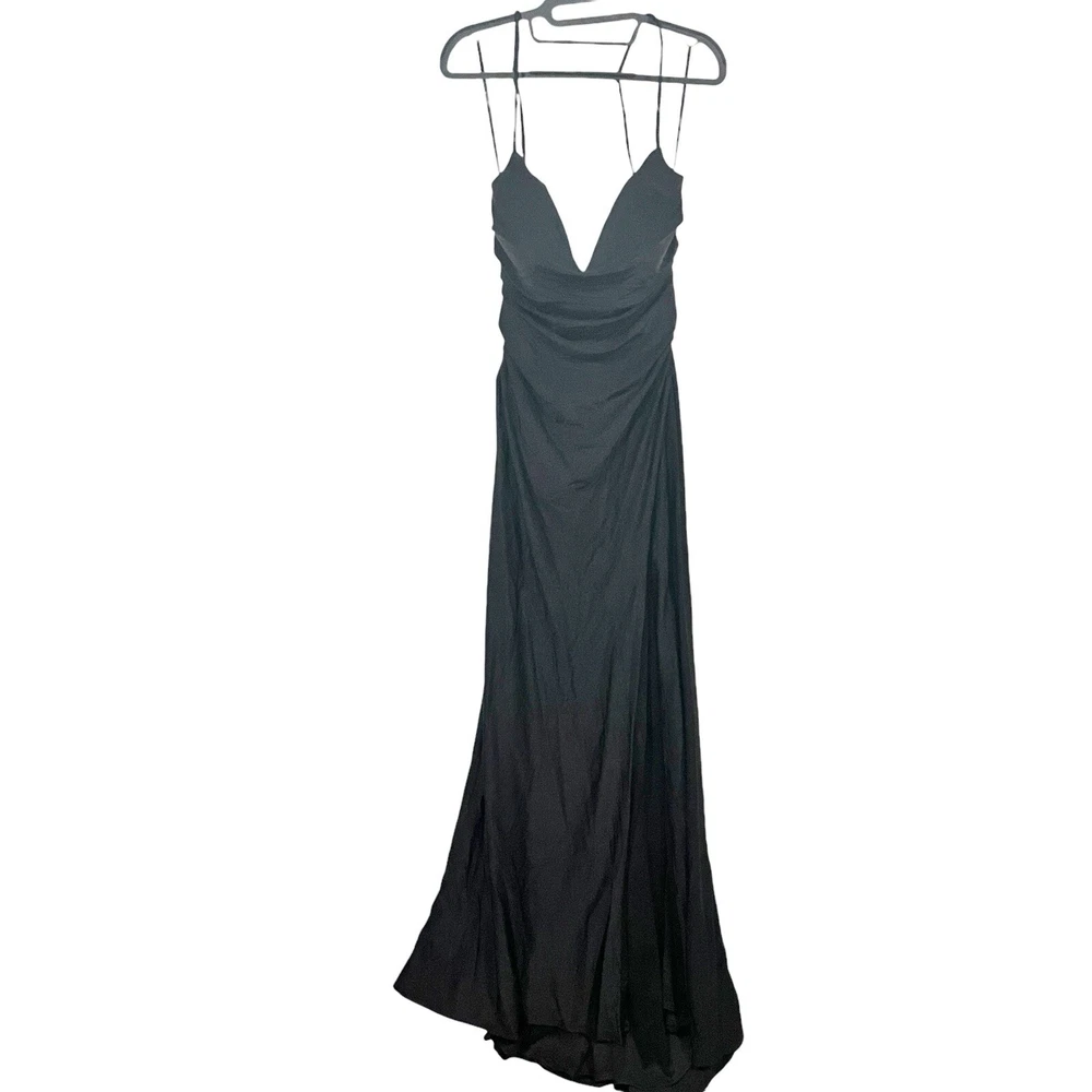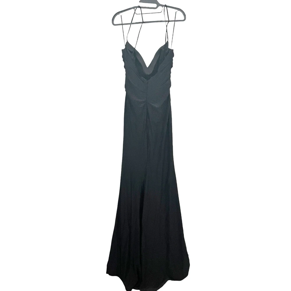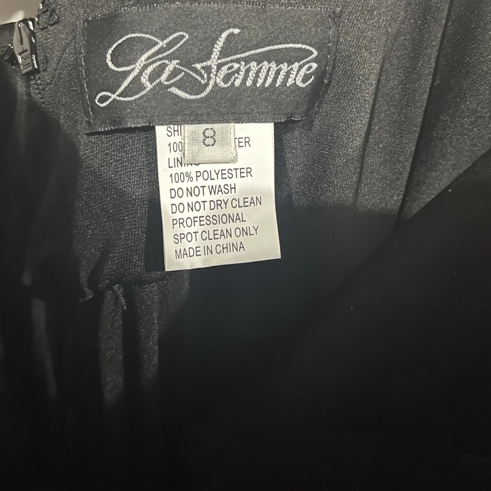 Made of a liquid shine satin like fabric, this formal dress from La Femme is sleek, sexy, and classy all at once. Hidden back-zip closure; clasps behind back for straps V-neck Sleeveless Dipped back with crisscrossing straps Floor-length trumpet skirt with a front slit and train Lined Good condition, no known flaws Size 8 (approx, on hanger) pit-pit 15” flat waist 14” length 63” Color: black Tags: classic, timeless, neutral, minimal, formal, prom, homecoming, black tie, wedding guest, special occasion