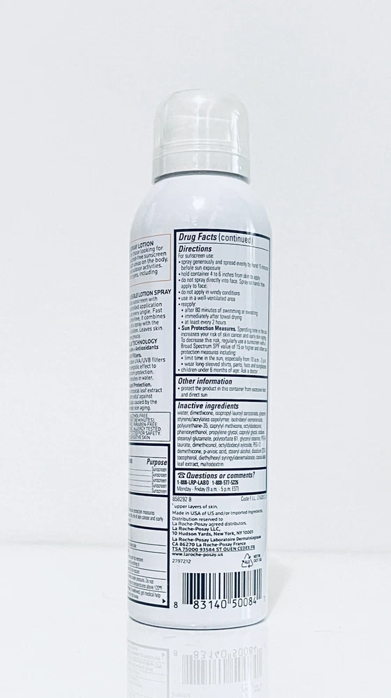 Product Line: La Roche-Posay Size: 5 fl oz Ingredients: Water, Aloe Vera Volume: 5 fl oz gtin13: 0883140500841 Sun Protection Factor (SPF): SPF 60 UVA Protection: UVA (EU Compliant), Broad Spectrum UPC: 0885781068131, 0883140500841 Body Area: Head, Face, Full Body, Leg Weight: 0.42lbs. Skin Type: All Skin Types Type: Physical (Mineral) Sunscreen Brand: La Roche-Posay Formulation: Spray Features: Gluten-Free, Waterproof, Oil-Free, Alcohol-Free, Animal Cruelty-Free, Hypoallergenic, Non-Comedogenic, Unscented, Paraben-Free, Perfume-Free GTIN: 0885781068131, 0883140500841 Period After Opening (PAO): 12M Active Ingredients: Aloe Vera