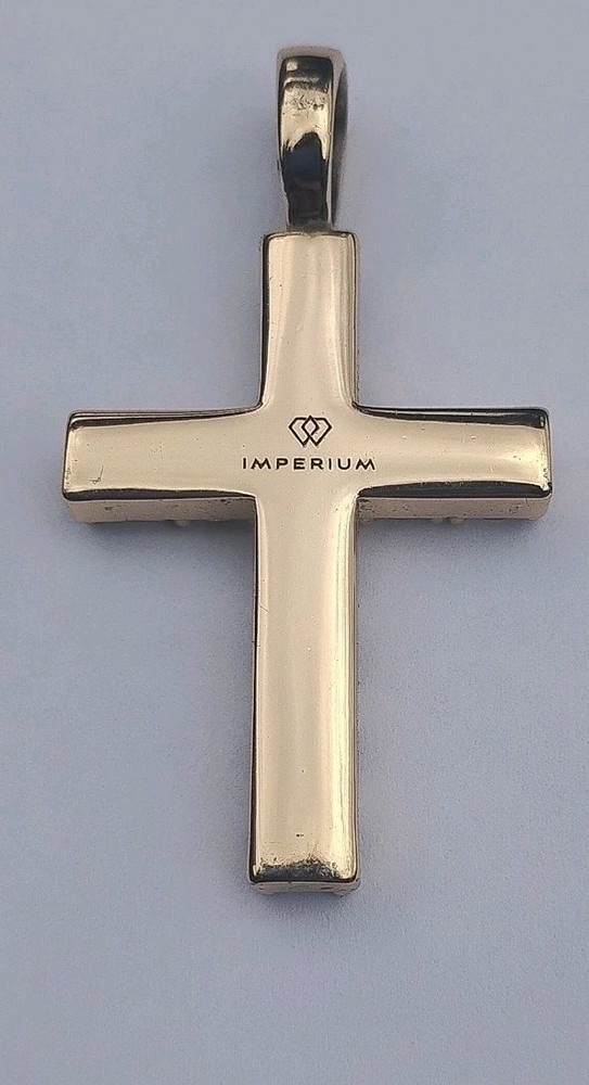18k Gold plated cross made by IMPERIUM. sweat proof Showcases 11 round cut 5A CZ stones with 7 smaller stones on the bail. Bail is fixed to cross and has no play! Very sturdy pendant at an affordable price. This is a Unisex piece good for a man or woman. I'll provide more pics if needed. Purchaser can look up info on IMPERIUM Brand for authenticity. This ships super fast and is a great gift for a loved one or for yourself. Thanks for looking 😊👍
