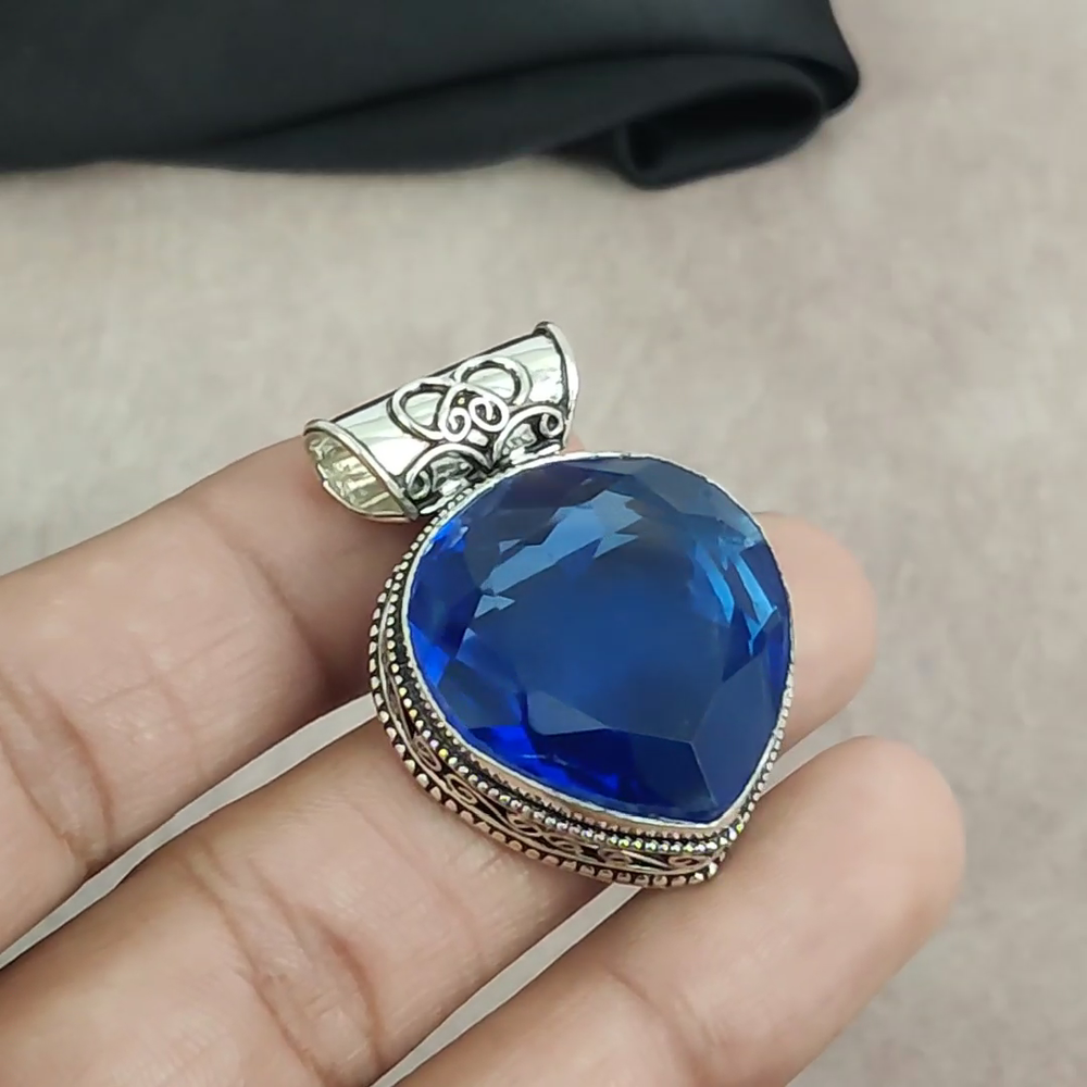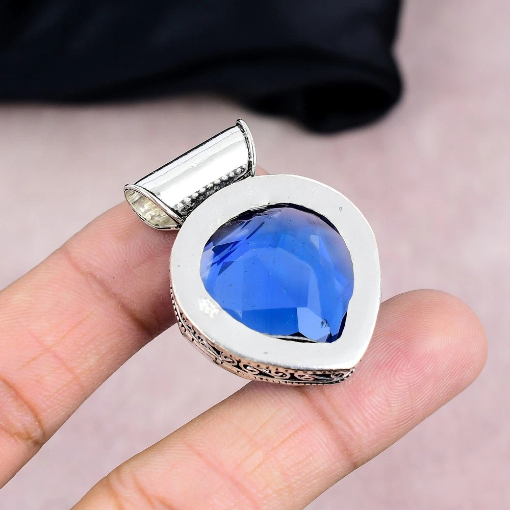 Lab-Created Blue Sapphire Sterling Silver Pendant Handmade Jewelry