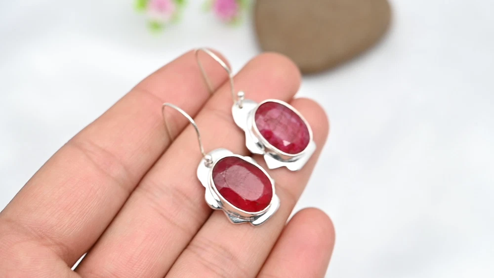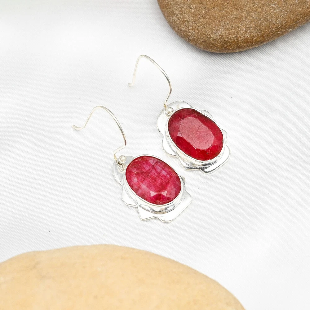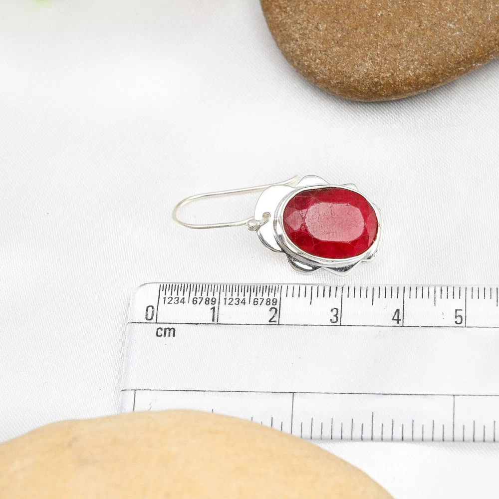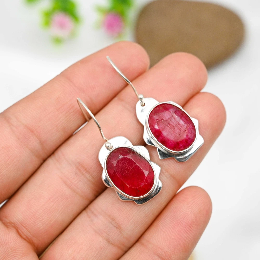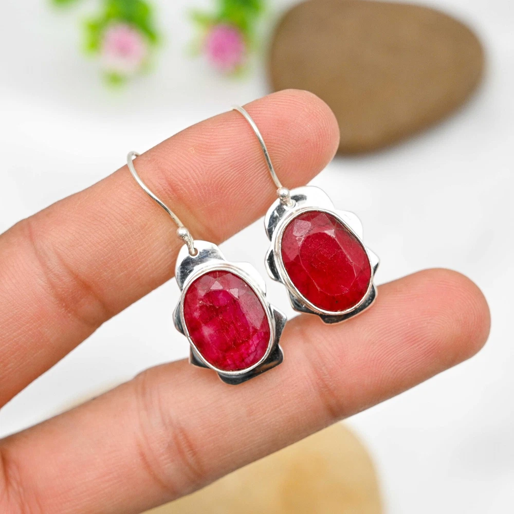 Lab-Created Ruby Gemstone Earrings Handmade 925 Sterling Silver Jewelry For Gift