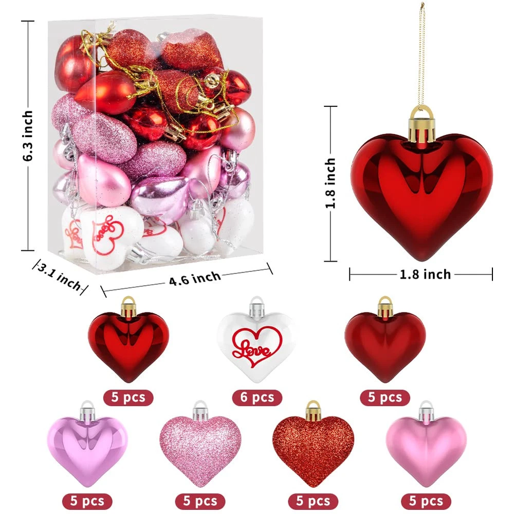 ❤️【Value Pack】This set of Valentines day decoration contains 36 plastic heart charms, including 6 white printed hearts, 5 red frosted hearts, 5 red glossy hearts, 5 red matte hearts, 5 pink glossy hearts, 5 pink matte hearts and 5 pink frosted hearts. Each measures approximately 1.8 inches. These beautiful heart-shaped decorations will definitely help you create a sweet and romantic atmosphere. ❤️【High Quality Materials】Made of high-quality plastic, these Valentine's Day heart ornaments are durable and lightweight, making them easy to carry and store. You don't have to worry about it fading or warping, so you can use it to make some decorations every year after. ❤️【Easy to Use】Our heart ornament has a golden string at the top of each heart bauble, which can be easily applied anywhere you want to decorate, showing sweet and romantic effect. Your wife, girlfriend, husband will really like this beautiful ornament. ❤️【Multi-Purpose】These lovely heart-shaped decor are suitable for Christmas, Valentine's Day, birthday parties, wedding parties, adding festive atmosphere to Valentine's Day parties, and can also be used to make handmade gifts or wreaths. The rich colors add color to your daily life, festivals and events. ❤️【Efficient After-Sales Service】We want to give all customers who buy our products the best quality shopping experience, we will have special after-sales staff to deal with the problems you encounter, any questions about the product please feel free to contact us, we will give you the most efficient and satisfactory treatment.