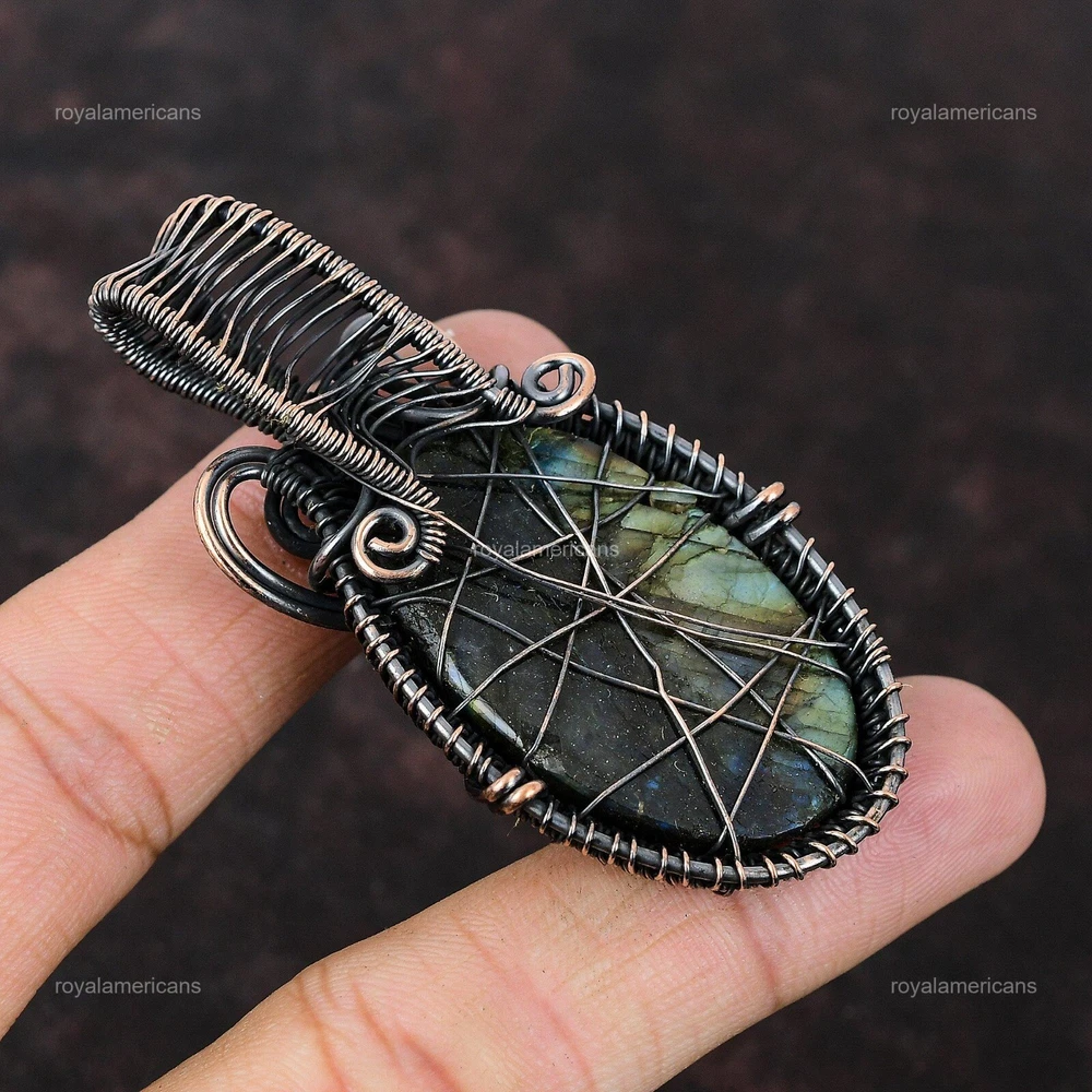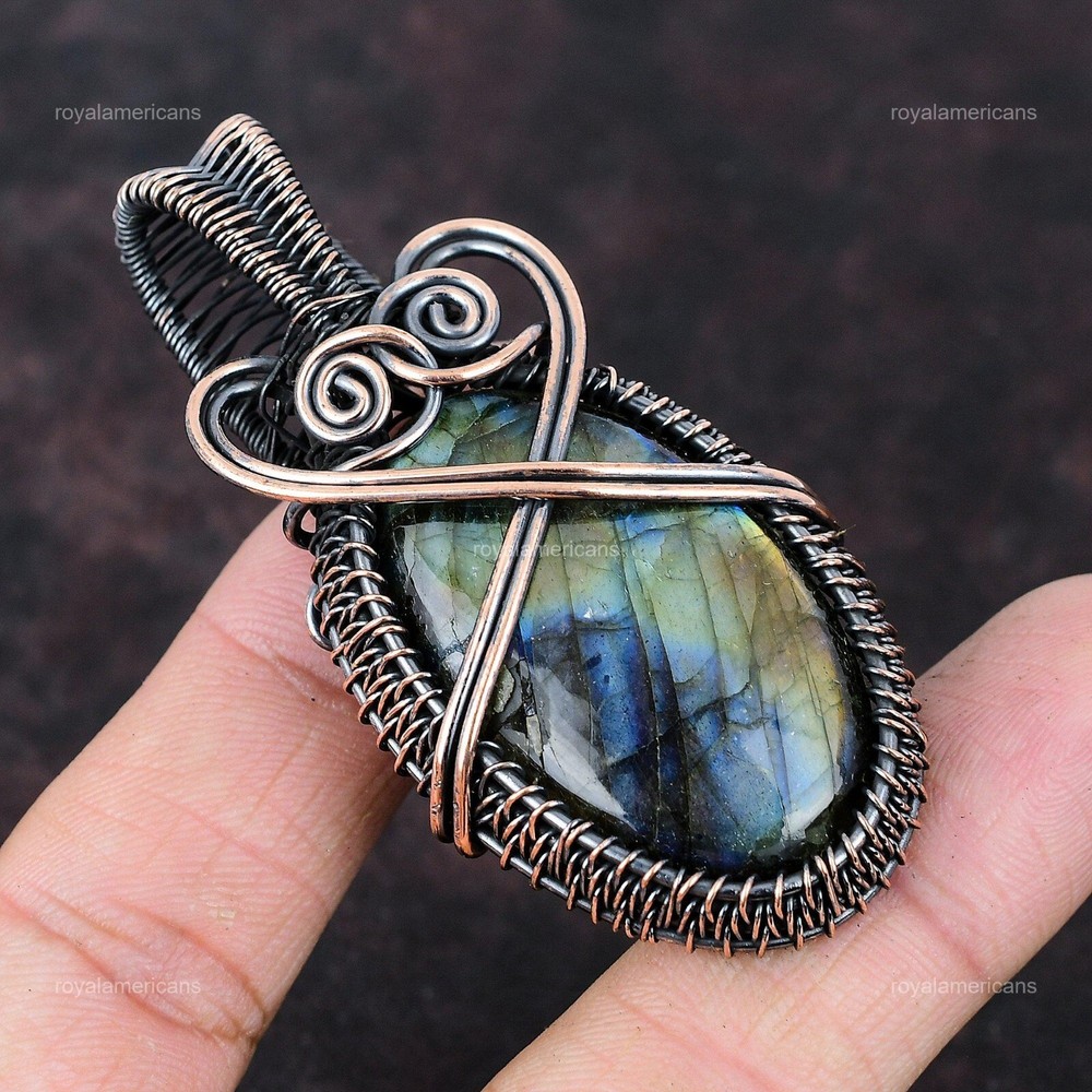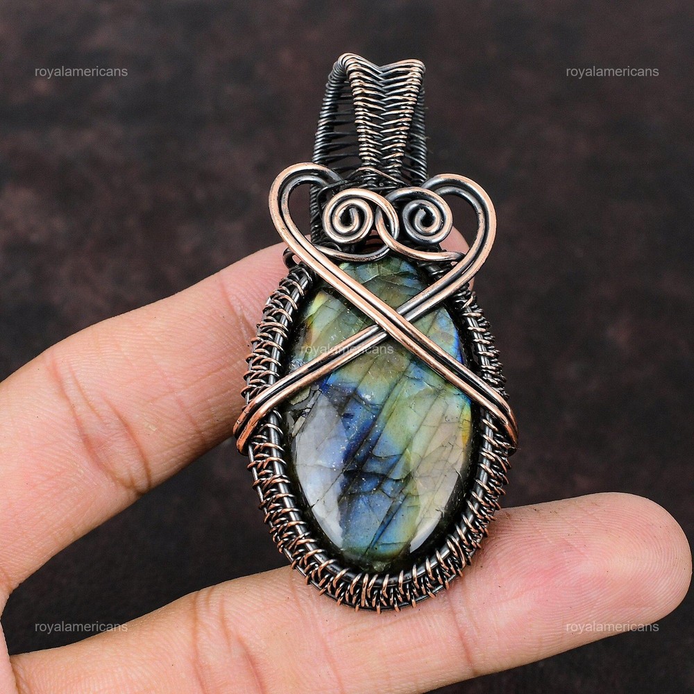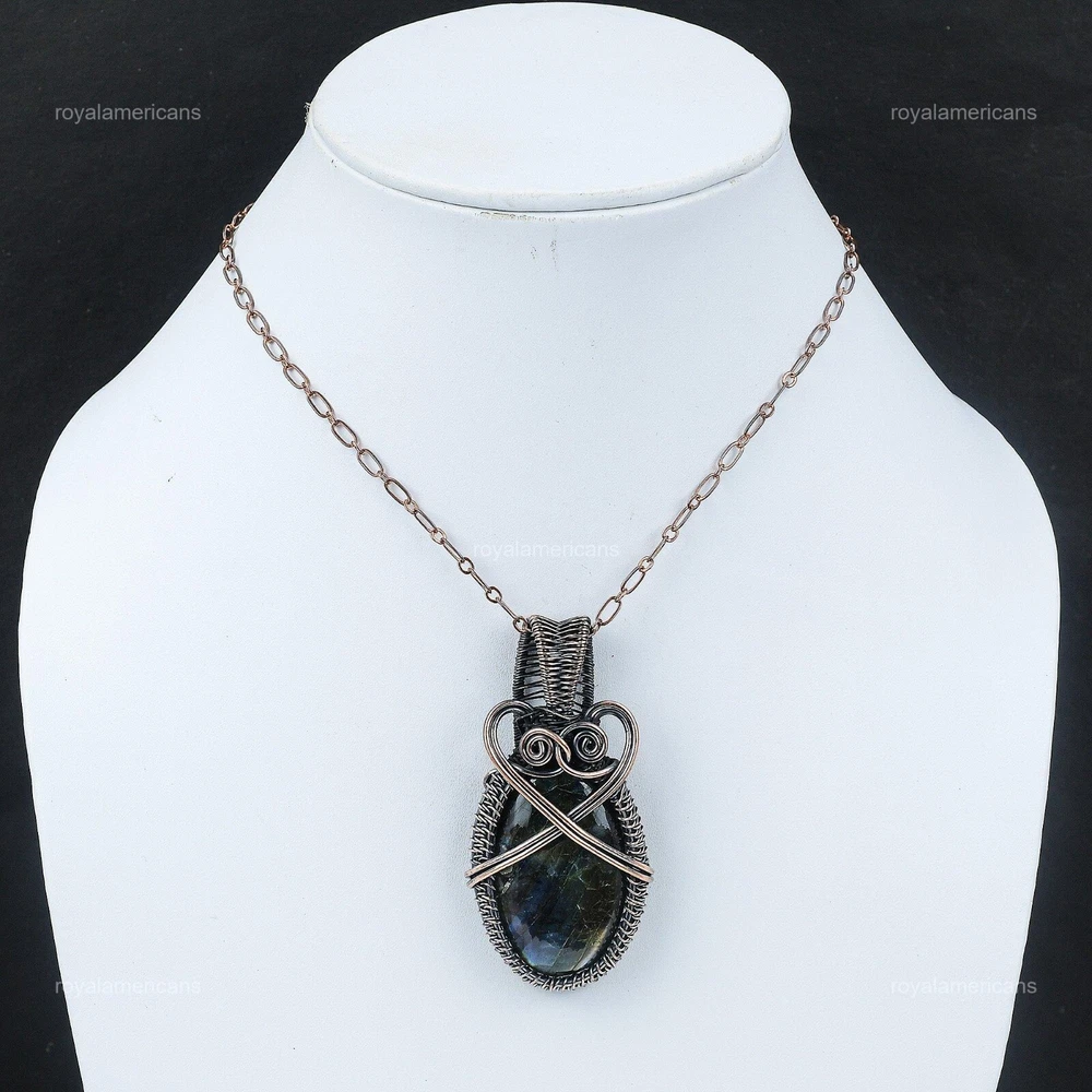 Note : Due to the natural formation of this gemstone. Slight variation in design and color are to be expected. Welcome to Royalamericans Mothers day Deal Labradorite Gemstone Wire Wrapped Sister Pendant Jewelry Copper Handmade Pendant, Wire Wrapped Pendant, Wire Wrapped Jewelry, Copper Pendant, Copper Wire Pendant, Wrapped Jewelry, Wire Wrap Pendant, Wire Wrap Jewelry SKU : UWP-545 Gemstone : Labradorite Stone Shape : Oval Metal Purity : Unknown Copper Length : Millimeters Width : Millimeters Copper has been used for jewelry making for thousands of years, dating back to ancient civilizations such as the Egyptians, Romans, and Aztecs. Copper was valued for its beauty, versatility, and durability, and was often used to make everything from jewelry and coins to cookware and tools. In addition to its historical significance, copper jewelry also offers several benefits. Copper is a natural conductor of heat and electricity, which makes it ideal for energy healing and therapeutic purposes. Wearing copper jewelry is believed to have various health benefits, such as improving circulation, reducing inflammation, and boosting the immune system. Some people also believe that copper jewelry has the ability to balance energy and improve mood. For Mother's Day Gift For Father's Day Gift For Promise For Valentine's Day For Halloween Party For Christmas Day Gift For New Year Party For Mom For Her If you can't find the information you need or need some advice for your design? Feel free to contact us. We are fast to reply :) All our work is made by hand with Love and Care in our workshop Thank you so much for visiting and hope you enjoy shopping with us Royalamericans is committed to delivering the best quality sterling silver jewelry to customers. As a handmade jewelry manufacturer, we offer an extensive selection of copper gemstone jewelry that showcases the brilliance of our craftsmanship. We are an experienced handmade jewelry supplier with expertise in embellishing gemstones to suit every style. We offer you the liberty to create your jewelry ensemble with sparkling, earthy, and pure gemstones. Our Talented artisans masterfully handcraft each piece of jewelry you see here. Our pieces are made with genuine gemstones.