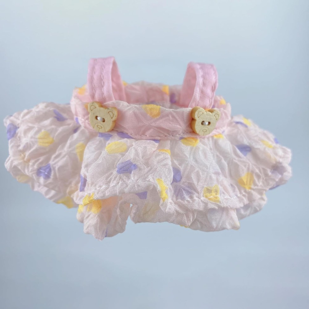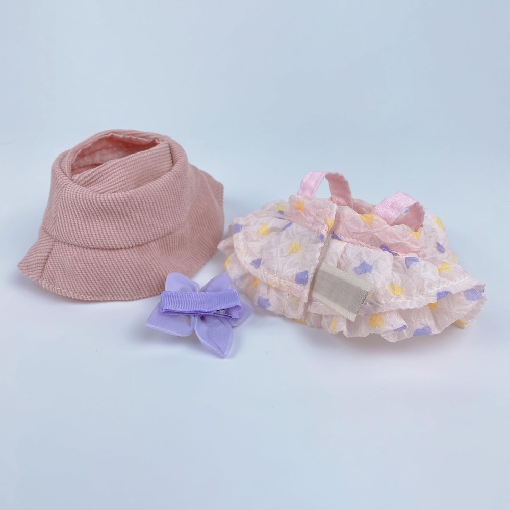 Package List Purple heart-shaped dress + small flower hair accessory + wavy straw hat + purple small water bottle (No Doll) Product Description Premium Materials: Crafted from high-quality knit fabric for the hat and delicate floral print fabric for the dress with soft pink and purple color scheme. Perfect Gift Option: This adorable outfit enhances your doll's charm with kawaii style. An ideal gift for children and friends on Christmas, Valentine's Day, Mother's Day, birthdays, and anniversaries. Fit For 15cm/17cm Dolls: Doll Clothes Tailored for Doll Series 1/2/3(Macaron Series/Have a Seat Series/High Alert Series). Elegant Design: Features a charming combination of vintage-inspired bucket hat and layered ruffle dress with decorative bear button accents. Complete Set: Includes a pink knit bucket hat with bunny patch, floral print ruffled dress with bear button details, and a purple flower accessory for 17cm dolls.
