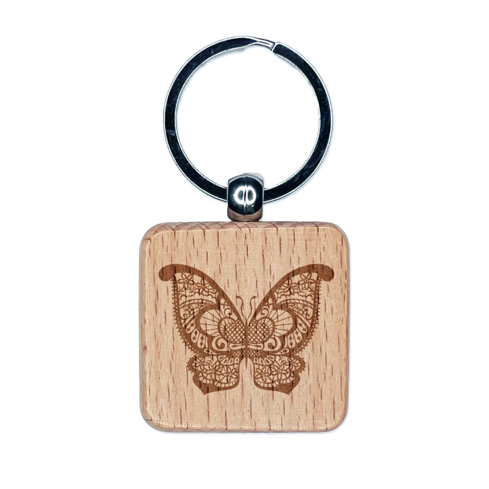 Lace Butterfly Engraved Wood Square Keychain Tag Charm
