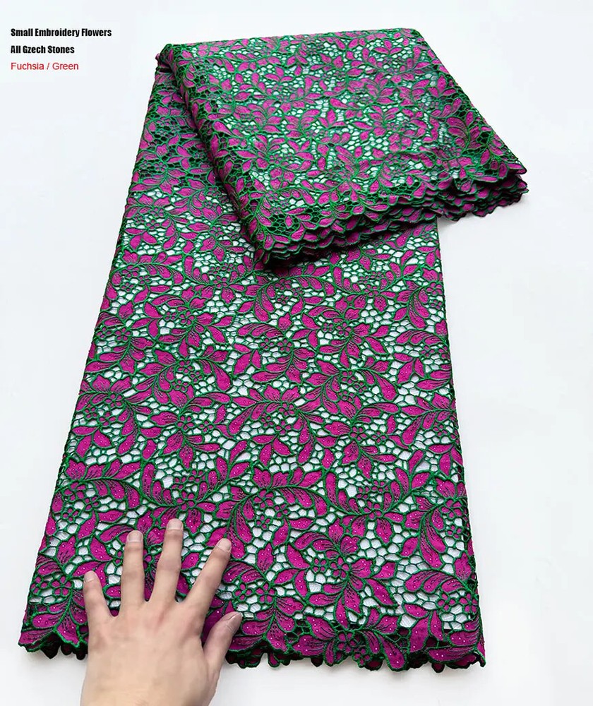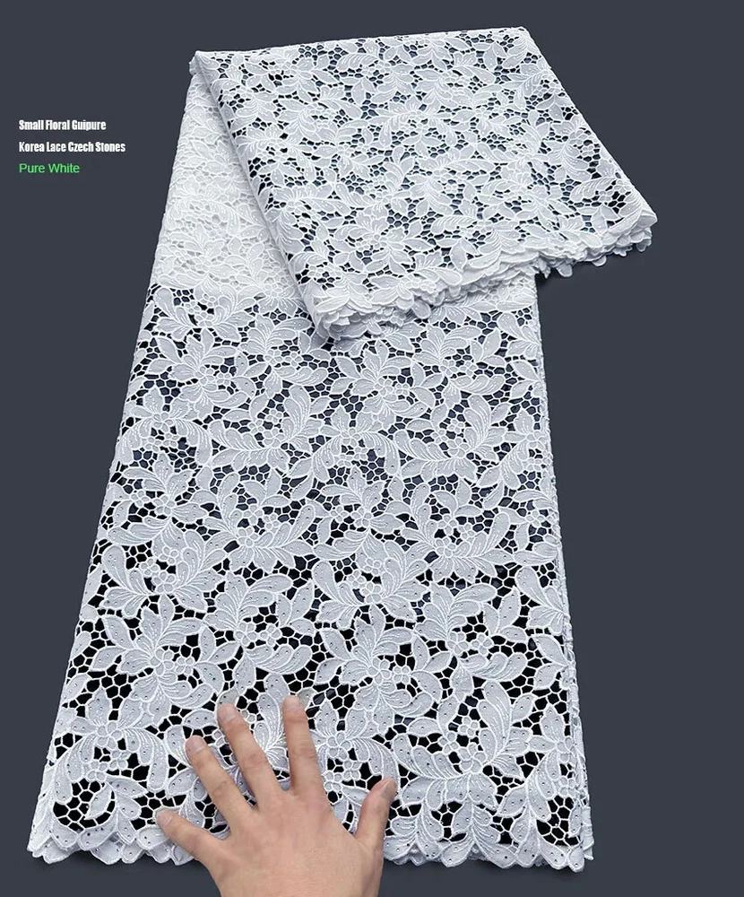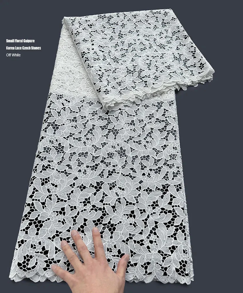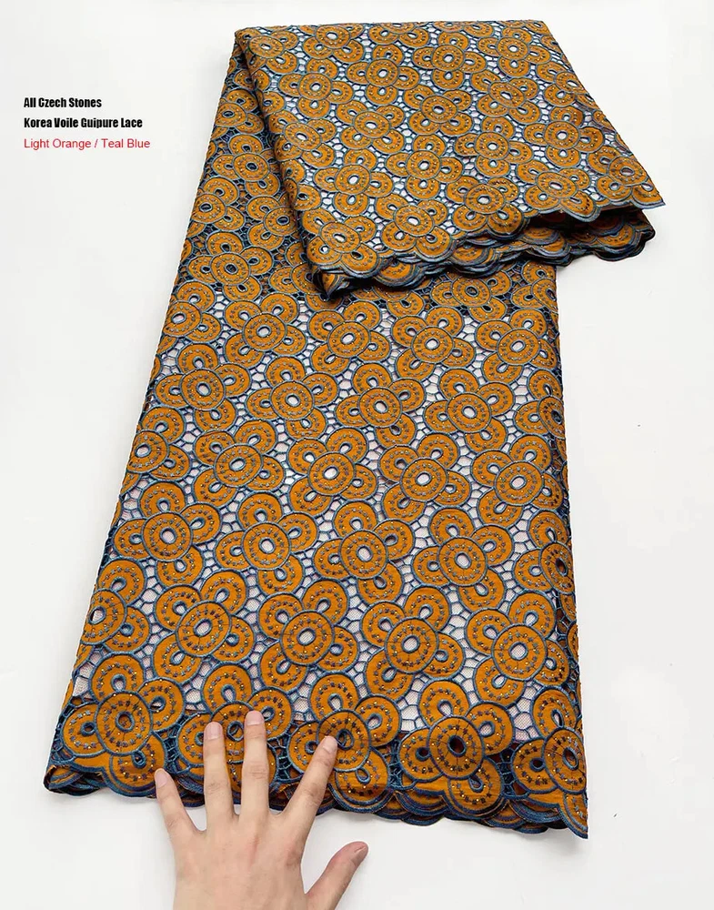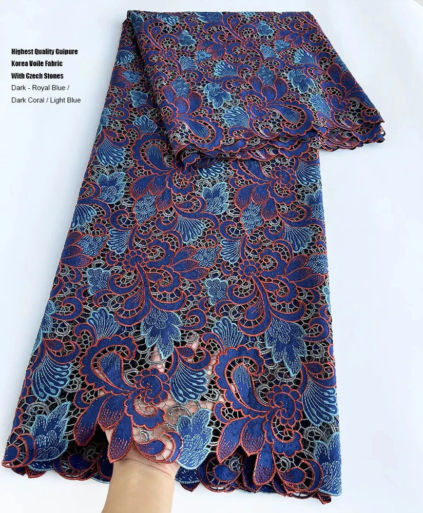 Length: 5 yards (4.57meters) Width: 51- 52 inches ( about 130 cm ) Features: Big Rich Voile Mix Guipure Use for: All Occasions Material: Cotton / Silk / Polyster Shipping: Fedex/ DHL / Post Mail Weight: 1.4 - 1.5 kgs per 5 yards Touch feeling: Soft & Super Neat Condition: Brand new and unworn Quality: Premium Quality Guaranteed Yes!! Hannlin Royal- Professional. Better Quality