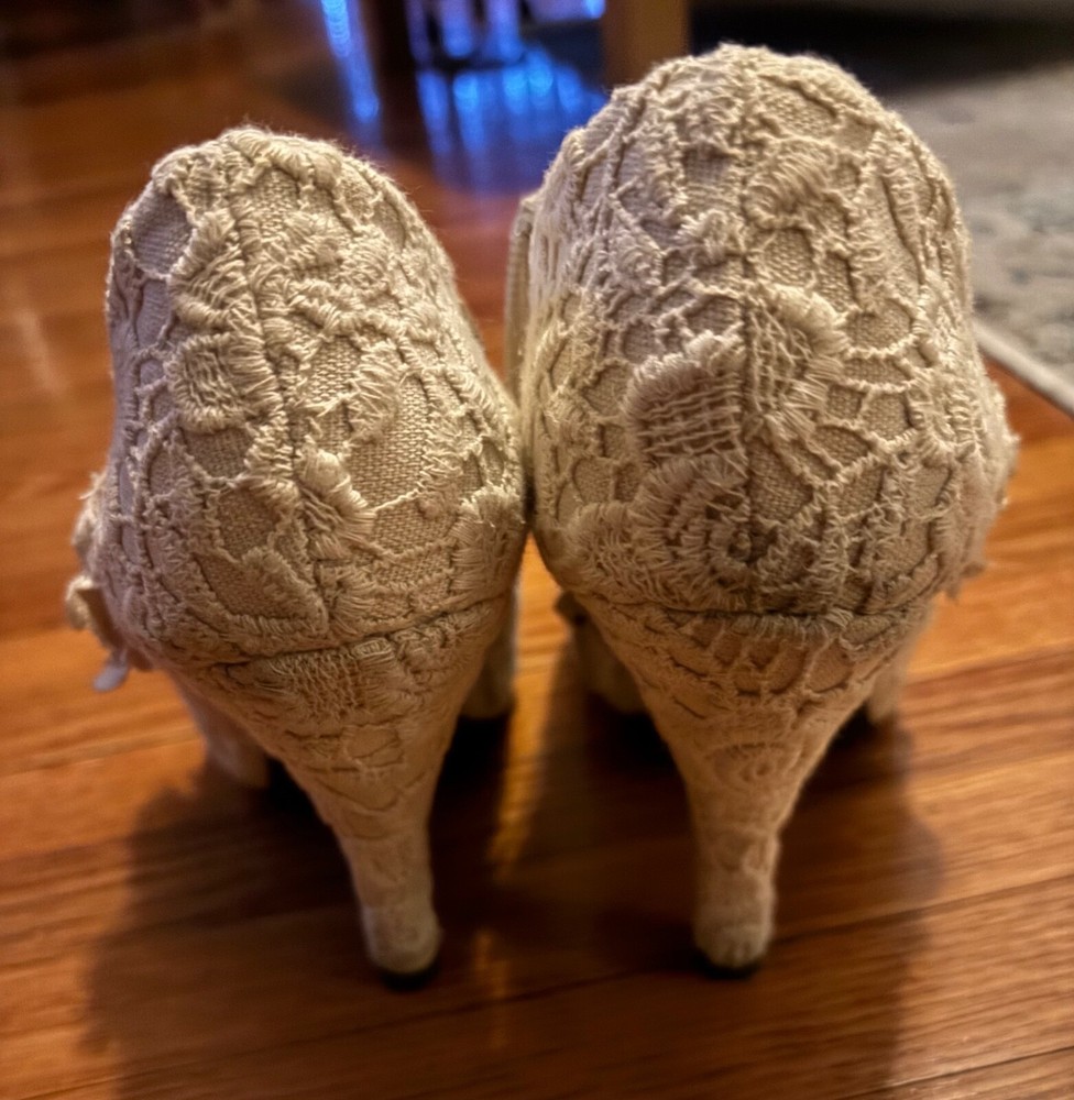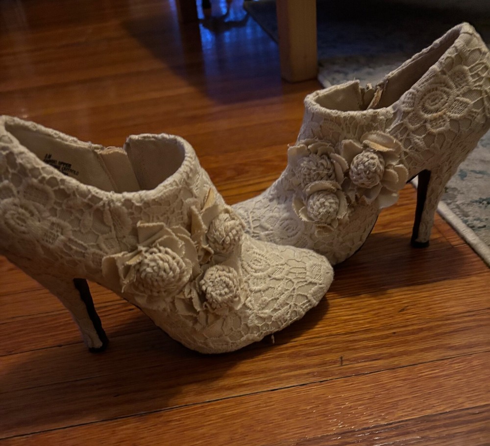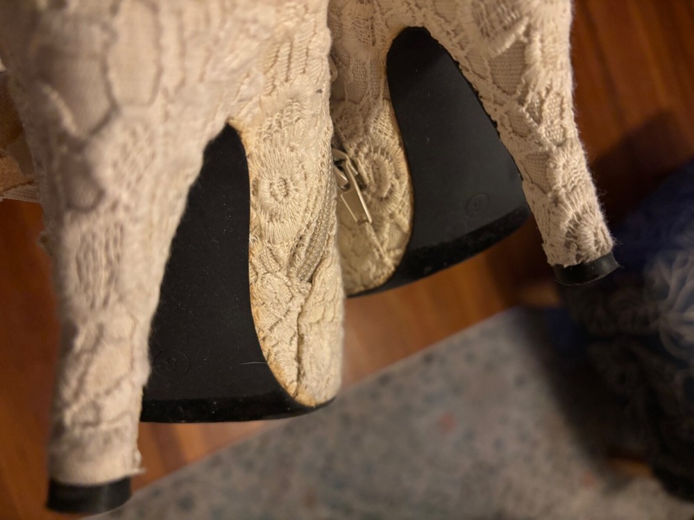 Style: Platform Closure: Zip Accents: Lace Department: Women US Shoe Size: 8 Upper Material: Cotton Type: Heel Color: Beige Heel Style: Stiletto Brand: Dolce