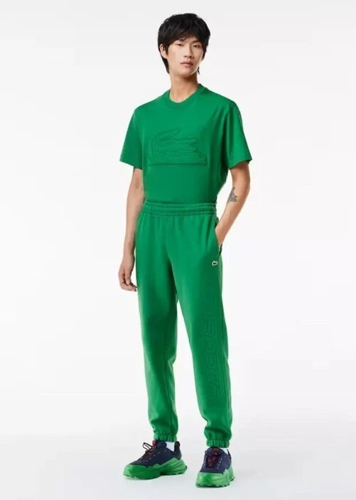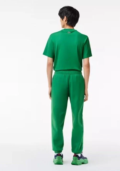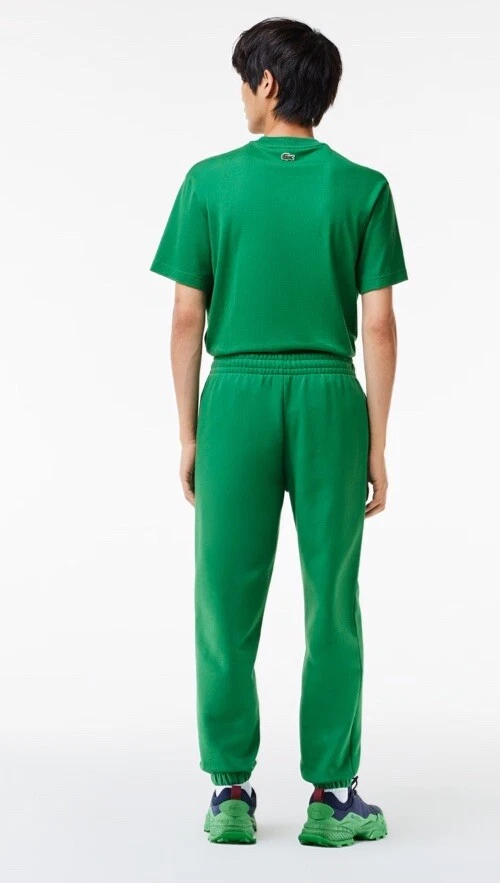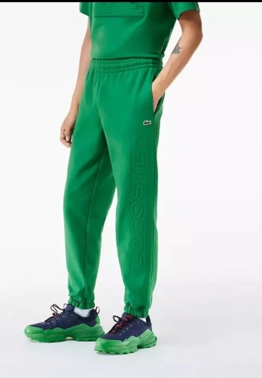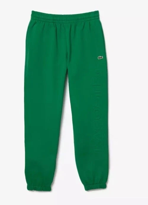 Elevate your style with these Lacoste men's sweatpants, featuring a rocket green color and embroidered logo detail. Made from a comfortable blend of polyester and cotton, these pants are perfect for any occasion, whether it be a casual day out or a formal event. The drawstring closure and adjustable waist ensure a secure fit, while the slash pockets provide ample storage space. These sweatpants are part of the Lacoste Sweatpants product line and are machine washable for easy care. The straight leg style and flat front design make them a versatile addition to any wardrobe, whether you're a hipster, hippie, or preppy dresser.