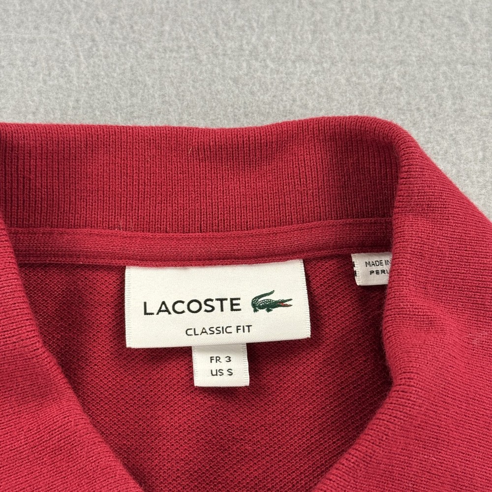 Lacoste Polo Shirt Mens Small Red Long Sleeve Classic Fit Crocodile Logo Preppy Condition: Gently worn, no visible flaws or stains, light general wear, overall excellent used condition Classic red long sleeve polo with two button placket Lacoste signature embroidered green crocodile logo at chest Tag reads: Lacoste Classic Fit, FR 3 / US S Made in Peru (as shown on tag) 100% cotton pique material for comfort and breathability Collared neckline, ribbed cuffs, timeless Lacoste styling Perfect for casual, business casual, or preppy looks See photos for all details and measurements Mens size Small Color: Red Style: Classic Fit Long Sleeve Polo Shirt Great addition to any wardrobe