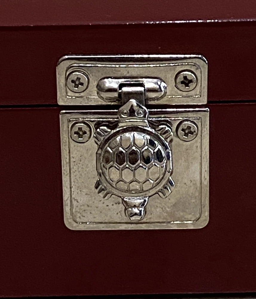 The "Lacquer Wood Inlaid Mother of Pearl Ducks Jewelry/Trinket Box" is a small rectangular trinket box measuring 4 inches in length. It is made of maroon lacquered wood with intricate inlaid mother of pearl ducks on the lid. The box is designed to store jewelry or small trinkets and features a lid for secure closure. This vintage piece is from the 1970s and was manufactured in Korea. The brand associated with this item is Imart, known for their collection of keepsake boxes.