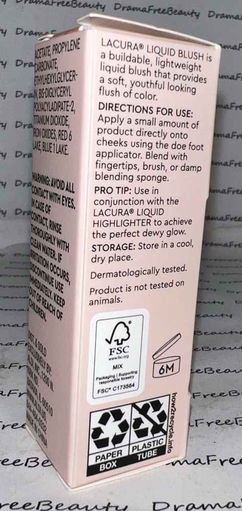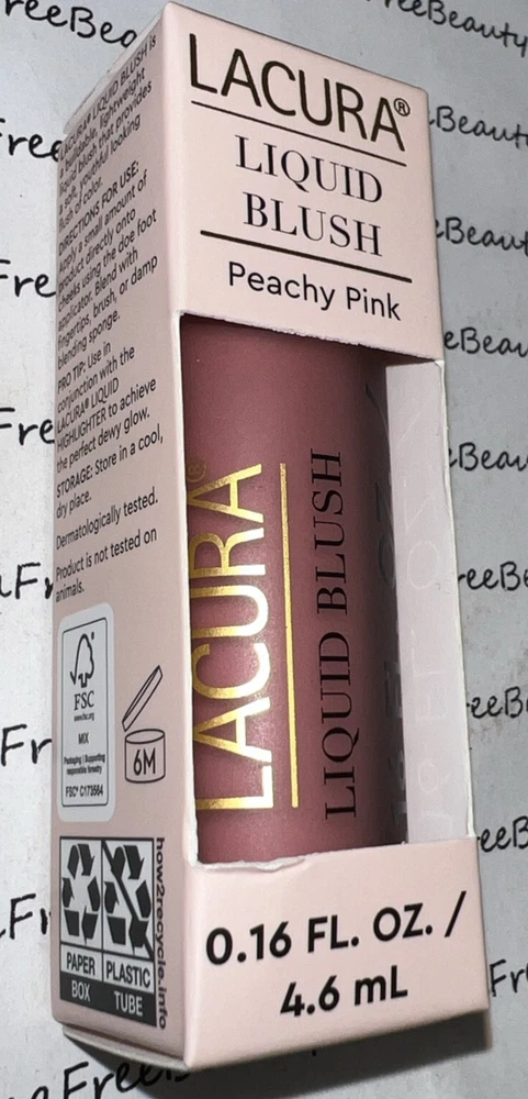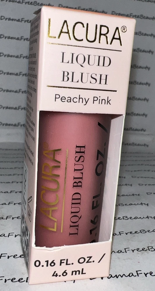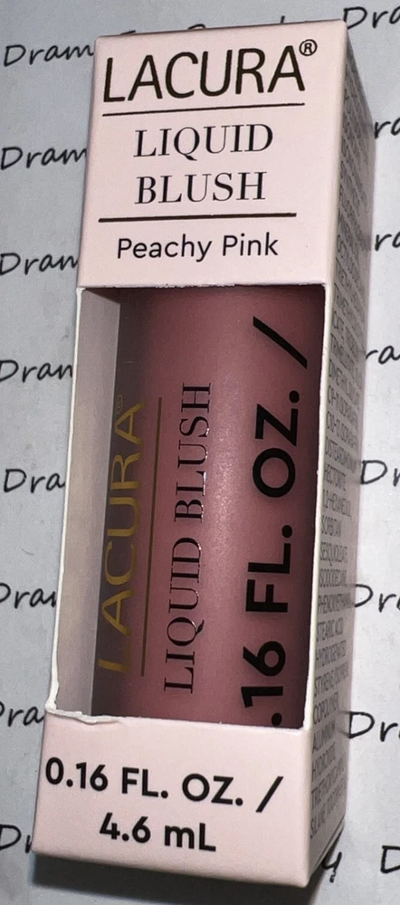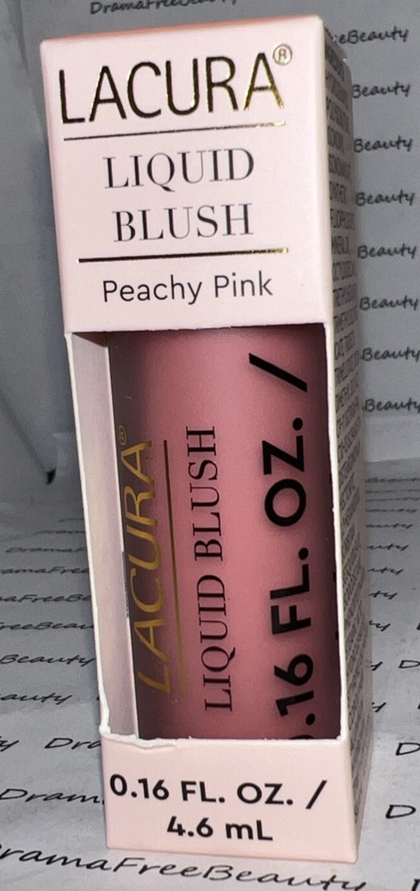 Lacura Beauty Liquid Blush in PEACHY PINK Full Size, 0.16 fl.oz. / 4.6 ml., Brand New in Box A lightweight, animal cruelty-free makeup product that is dermatologist-tested. With a soft and youthful looking effect, this liquid blush is buildable and perfect for achieving a natural rosy glow.