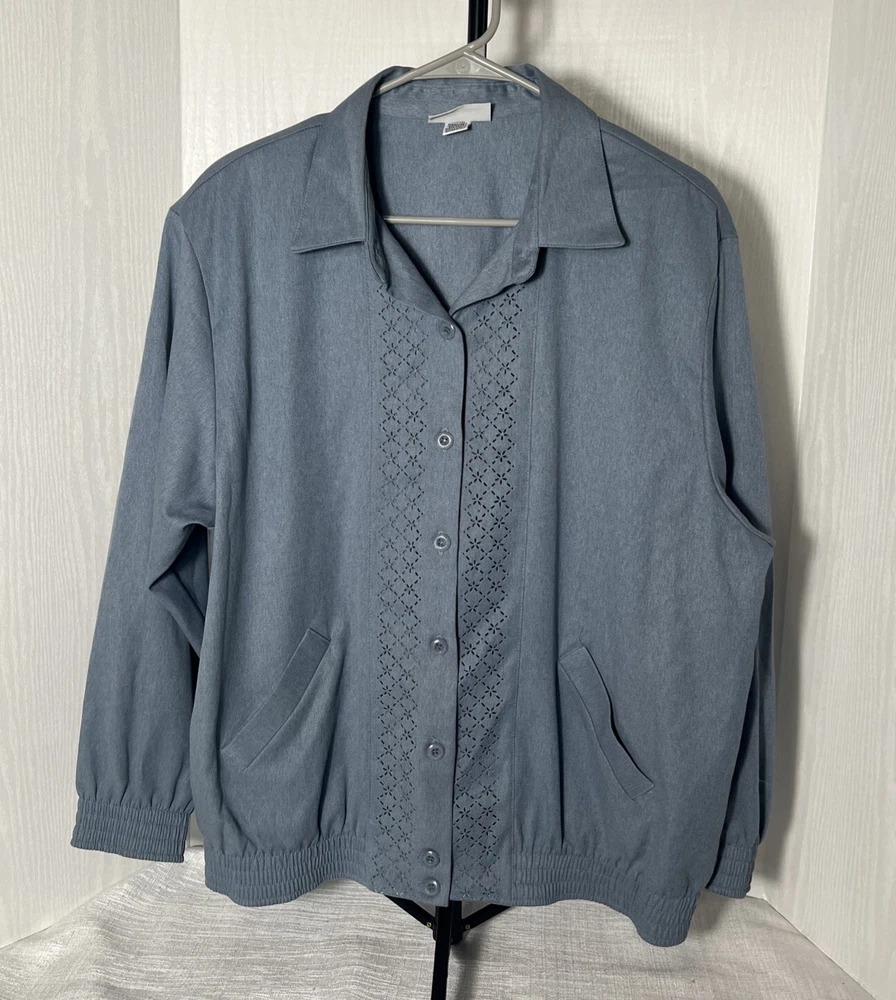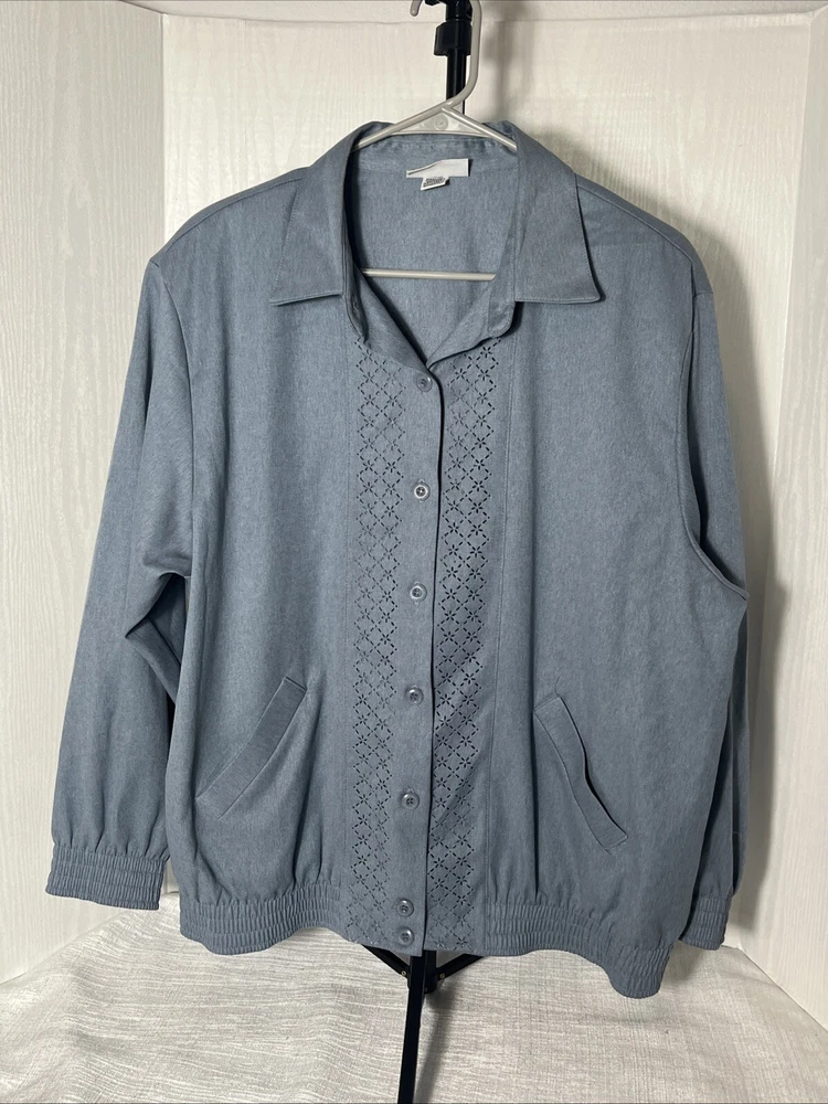 Outer Shell Material: Polyester Cotton Type: Jacket Garment Care: Machine Washable Department: Women Vintage: No Brand: Alfred Dunner Features: Shoulder Pads, Laser Cutting, Elastic Cuff & Hemline, Washable Pattern: Solid w/ Floral Laser Cutting Season: Fall, Spring, Summer Lining Material: None Country/Region of Manufacture: United States Character: None Occasion: Casual, Everyday, Work wear, & Social Personalize: No Color: Slate Blue Jacket/Coat Length: Hips Size Type: Regular Sleeve Length: Long Sleeve Style: Basic Everyday Jacket Size: 14 Theme: Classic, Outerwear, Everyday wear Fit: Regular Accents: Collared, Washable, 2 Front Pockets, Full Button Front Closure: Button Front Insulation Material: none Handmade: No