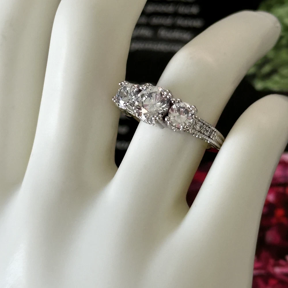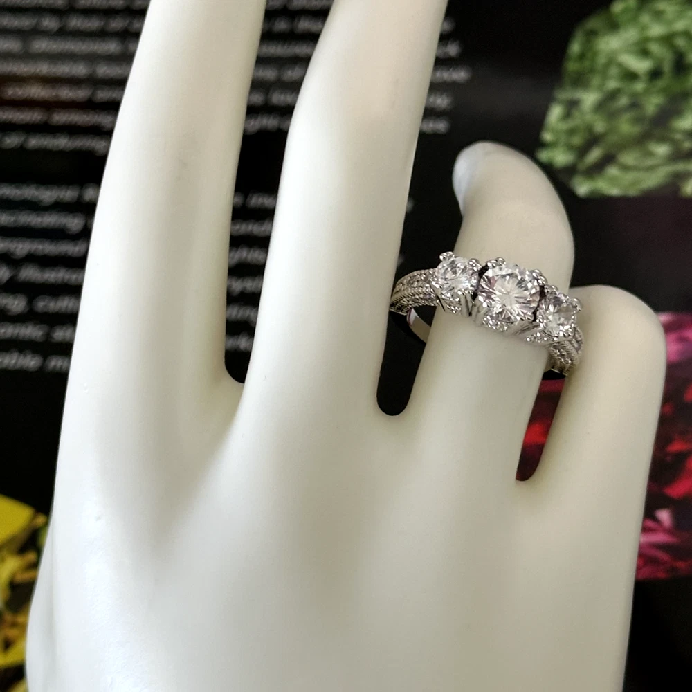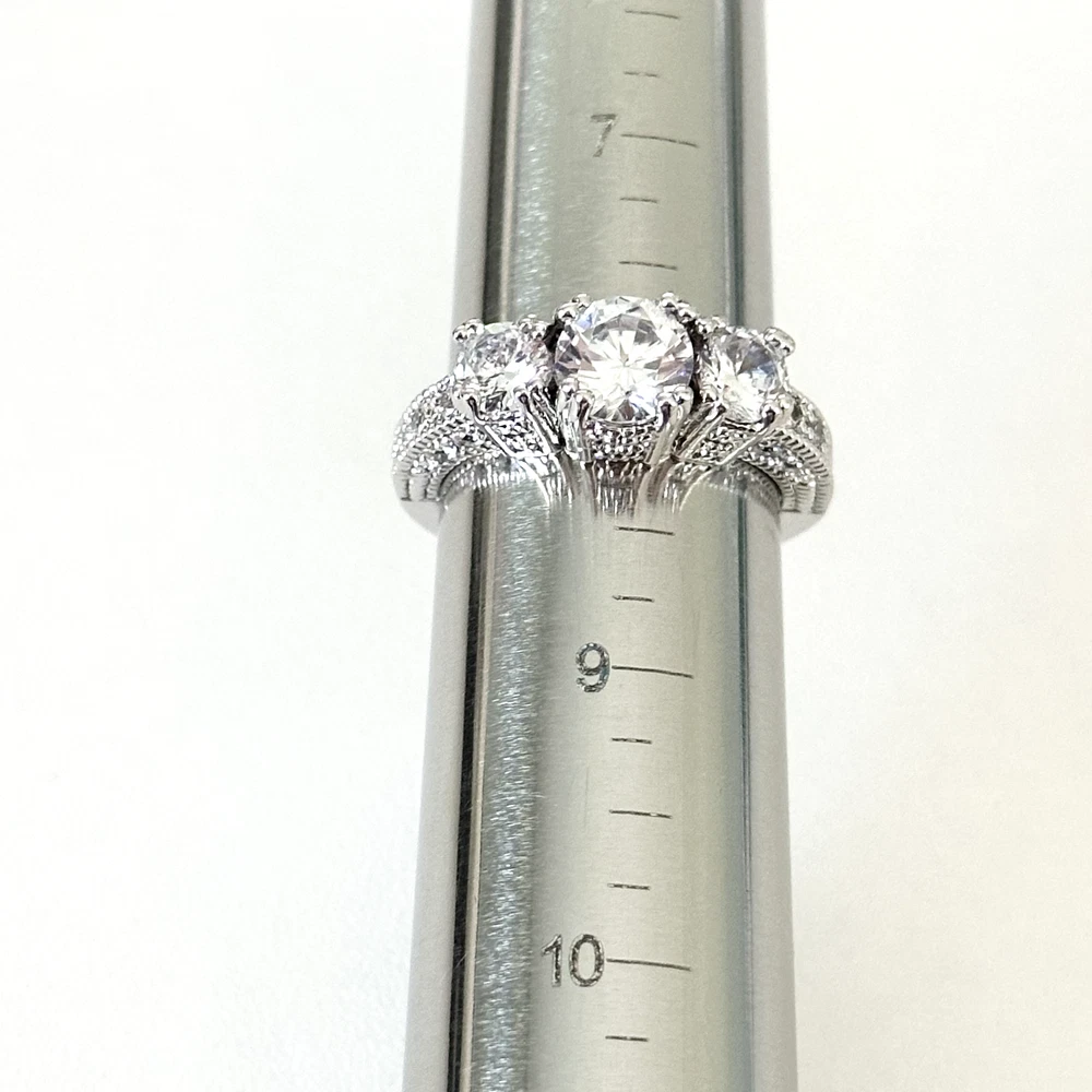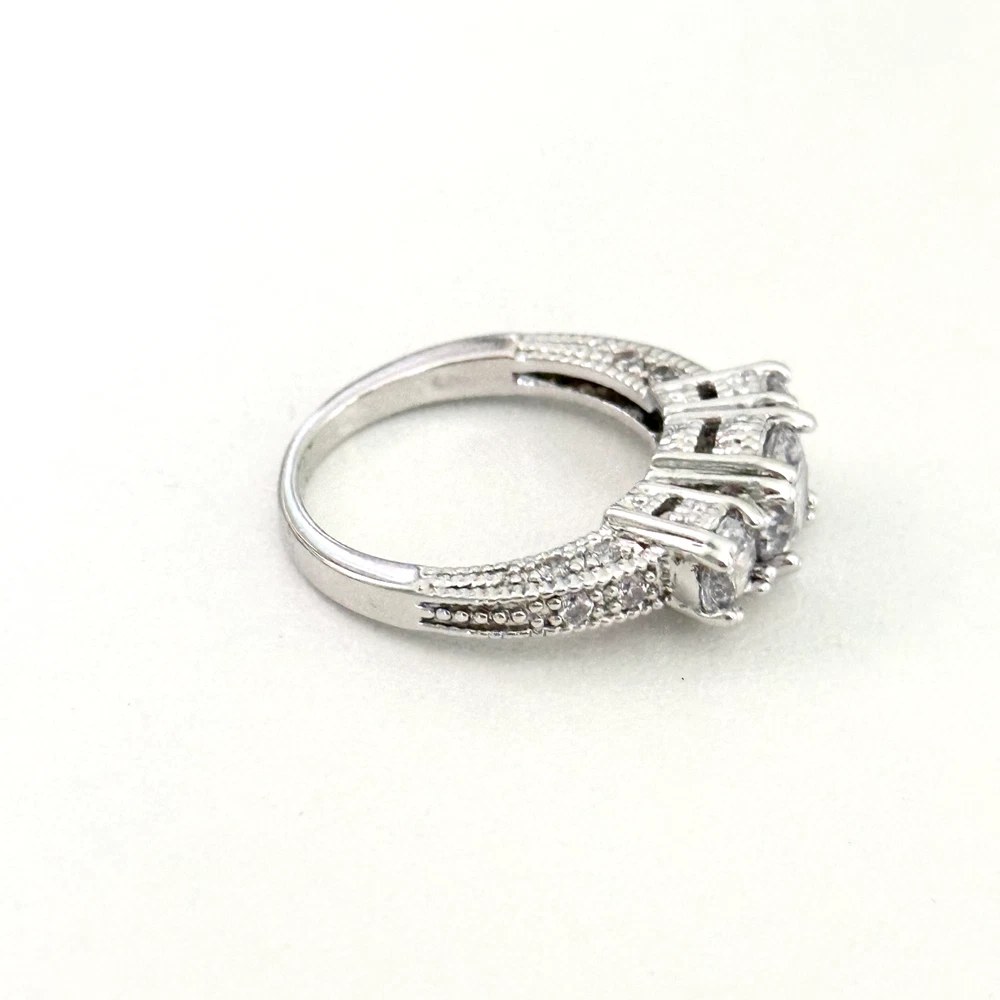 Ladies Clear CZ Three Stone Sparkly Engagement Style Statement Band Ring Size: 8 Stone size: 7.5mm Excellent condition. - Fast shipping, I ship the same or next business day! I also combine shipping. - Thank you so much for shopping with me and please check out my other jewelry listings, I post new pieces daily!