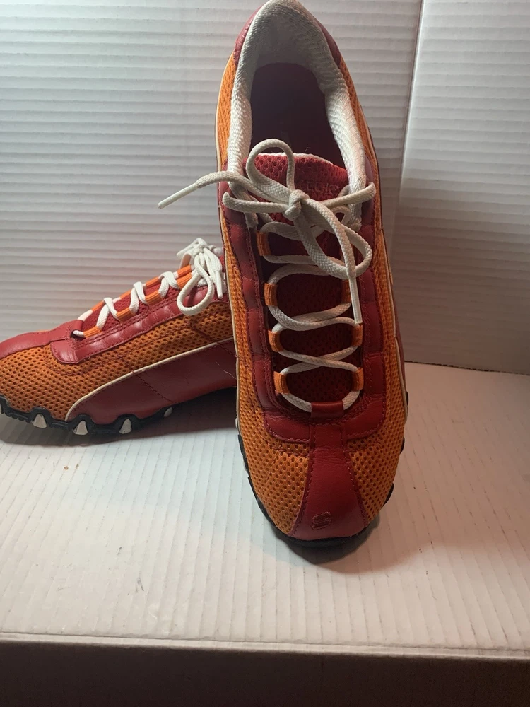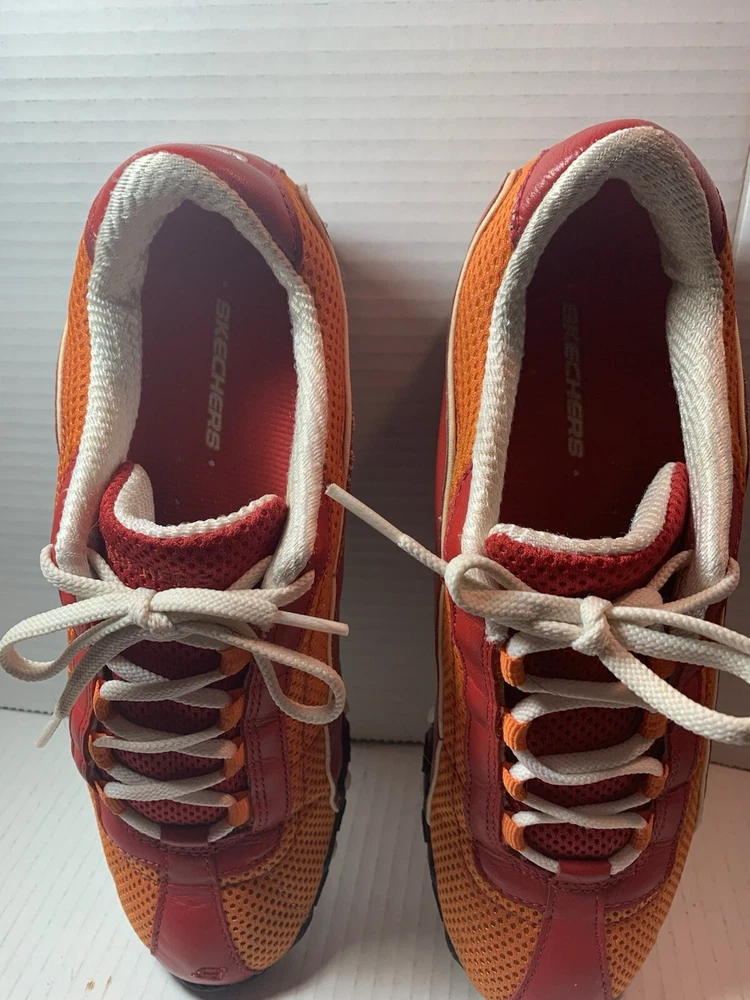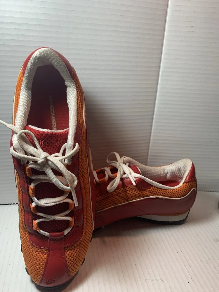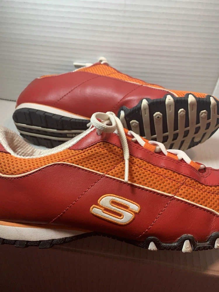 Step up your shoe game with these vibrant orange and red Sketchers sneakers! Made with leather and featuring a slip-resistant rubber cleat, these athletic shoes are perfect for any occasion - whether it's for activewear, casual workwear, or just for everyday casual wear. The breathable fabric insole ensures your feet stay cool and comfortable, while the insulated feature keeps them warm in the winter and cool in the summer. These size 9 1/2 shoes are perfect for any sports or performance activity, including bowling, baseball, and basketball. The Sketchers Street product line is known for its colorful and trendy designs, and these sneakers are no exception. With a medium shoe width and a comfortable fit, these shoes are a must-have addition to any wardrobe.