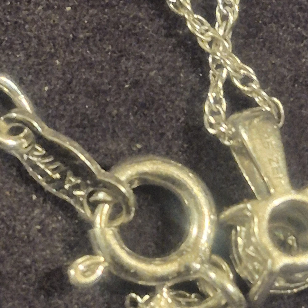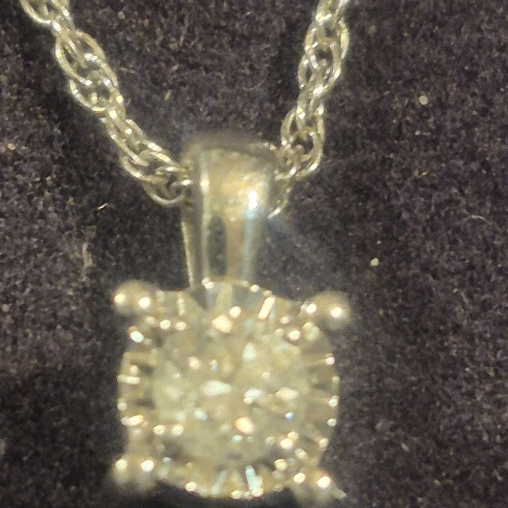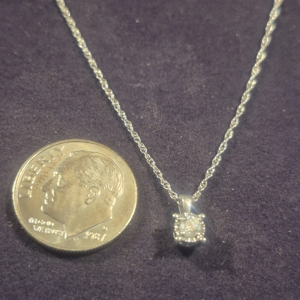 This ladies necklace features a stunning diamond pendant set in sterling silver, making it a perfect accessory for anniversaries. The pendant is signed by Zales and the necklace is 18 inches in length with a total carat weight of 1/10 carats. The elegant design includes a prong setting for the round white diamond, adding a touch of sophistication to any outfit. The chain style adds a classic touch to the charm pendant, making it a versatile piece that can be worn for any occasion. It is a very small diamond so its placed next to a dime for scale. It is new with box.