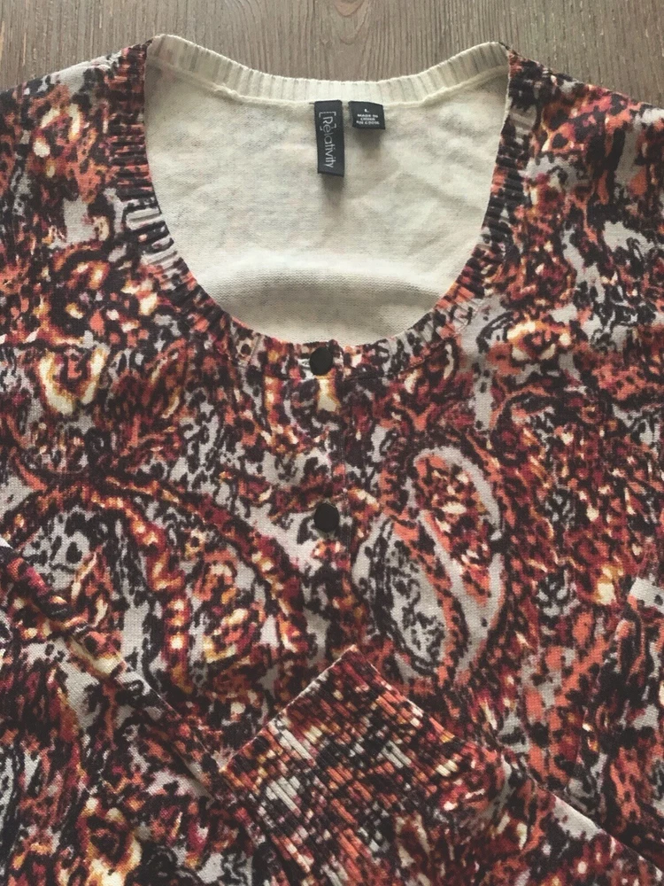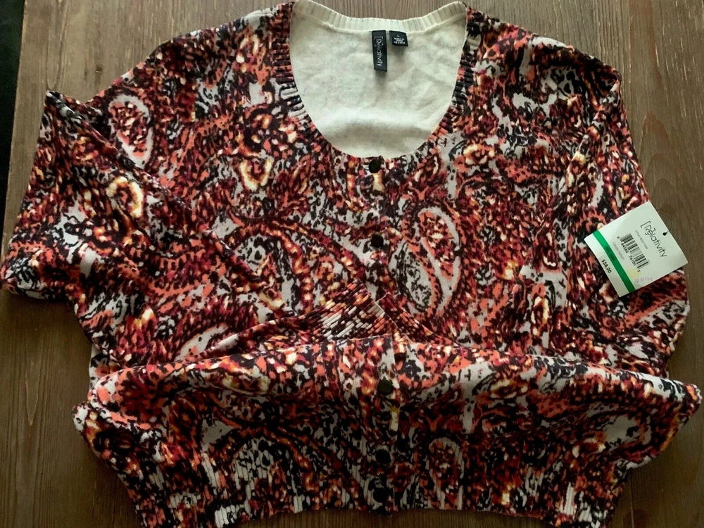 Beautiful deep orange, black & off white color scheme, smooth soft cotton texture, 8 black buttons front closure, ideal over blouse/top or alone