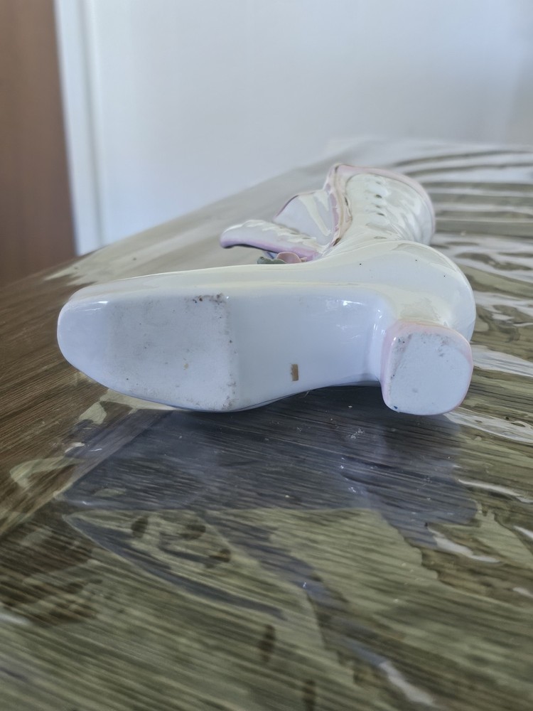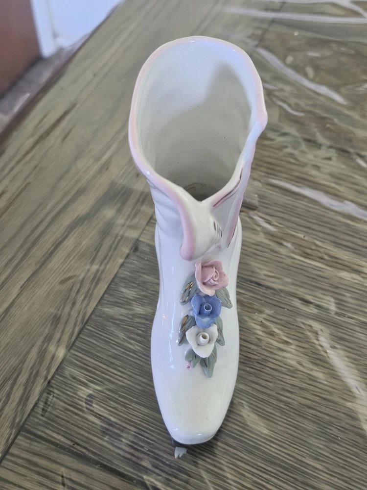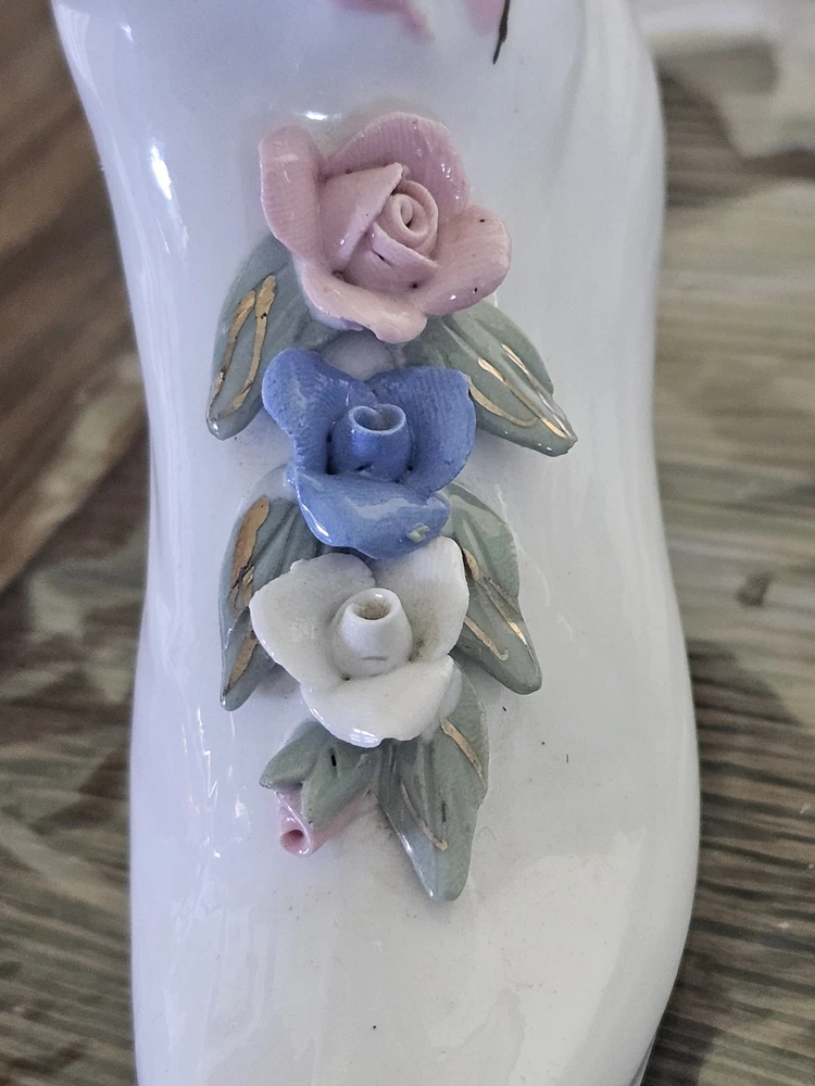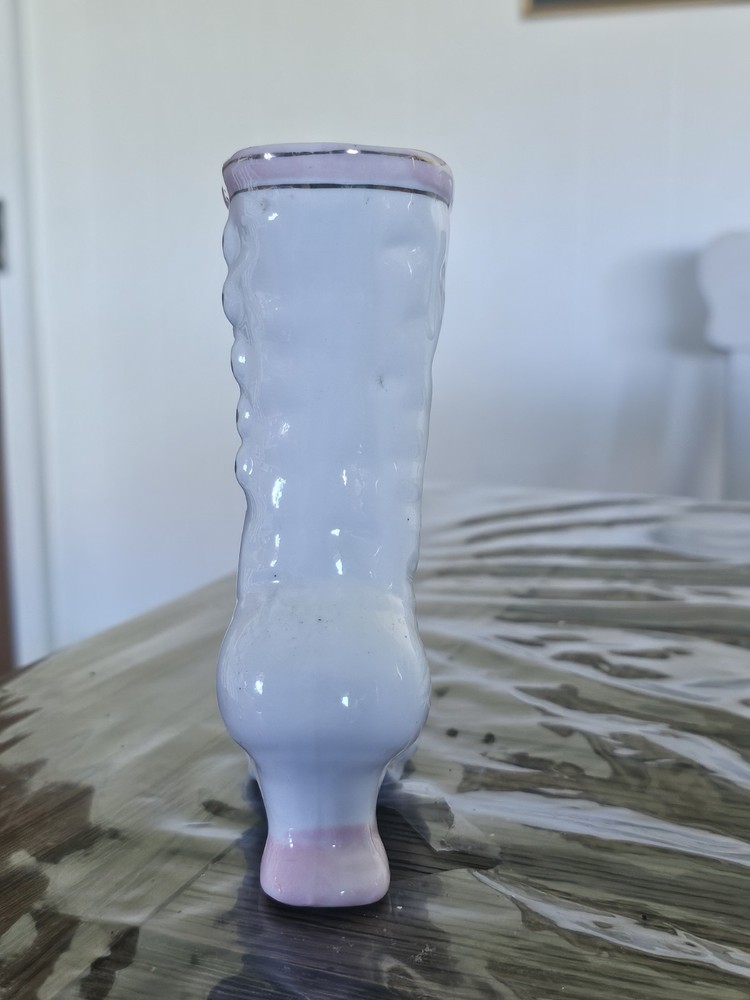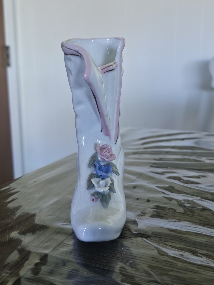 This Ladies Victorian Ceramic Button Boot 3D Bud Vase Planter in blue and ivory color is a unique and stylish decorative collectible piece. With a Victorian theme and flower pattern, this vase adds a touch of elegance to any space. Made of ceramic with a high gloss finish and glazed details, this 6" vase is perfect for displaying flowers or as a standalone decorative item for adults' departments. Its feminine design and period style make it a lovely addition to any collection, especially for those interested in vintage aesthetics.